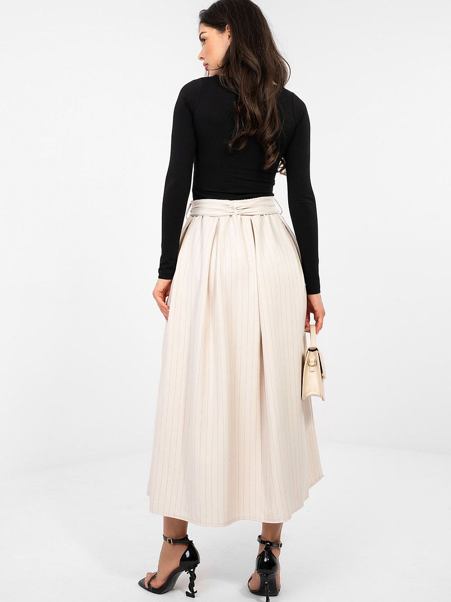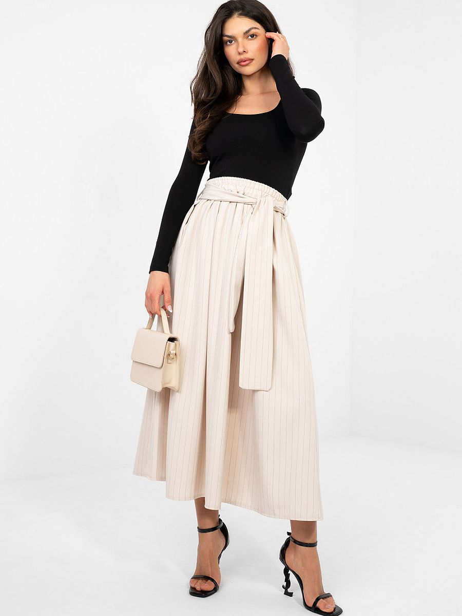 An elegant midi skirt with a flared cut is a perfect choice for women who appreciate classic style with a touch of modernity. The high-waisted model beautifully accentuates the waist, while the elastic band sewn into the waist ensures a perfect fit and comfort throughout the day. The skirt is made of striped material, which adds a stylish character and visually slims the silhouette. The set includes an attached tie belt, allowing you to further emphasize the waist and give the styling an individual expression. Practical slip pockets increase the functionality of the model. Made of a combination of polyester, viscose, and elastane, it combines durability with softness and elasticity, guaranteeing comfort and an elegant look in both office outfits and special occasions.