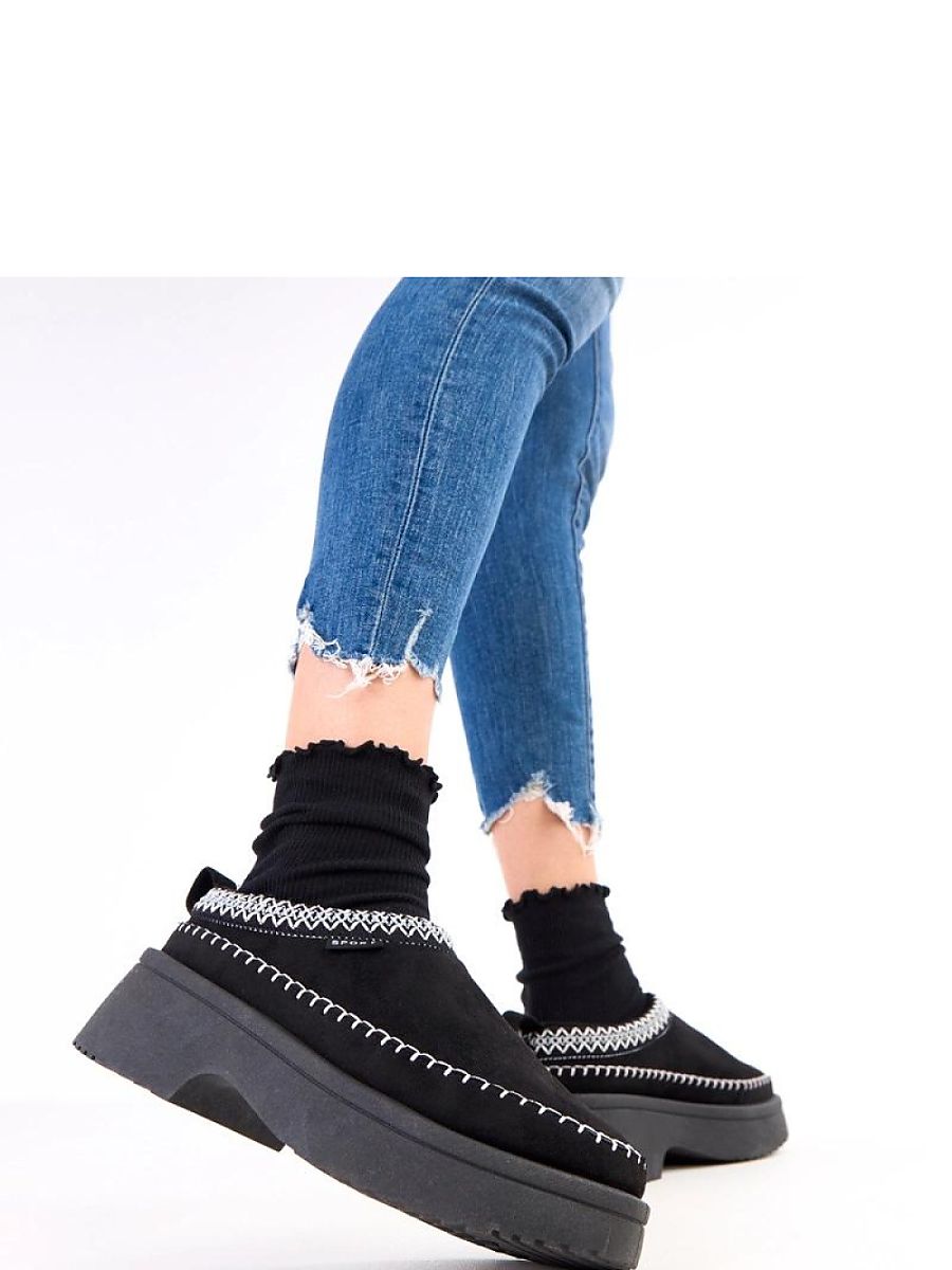 Women’s slip-on slippers with decorative embroidery, combining comfort with an elegant touch. Made of eco-friendly suede leather, they look stylish and are pleasant to the touch. The soft fabric insole provides wearing comfort, and the rubber sole with a 5.5 cm platform adds stability and slightly elevates the silhouette. The round toe emphasizes the classic character of this model, perfect for everyday wear.