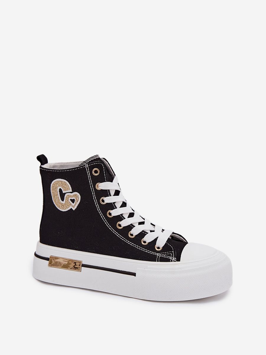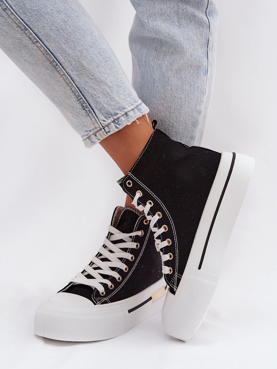 Women’s sneakers on a massive platform are a stylish proposal for everyday wear. The thick platform ensures comfort and stability, and the gold element placed on the platform adds an elegant accent to the whole. On the side, there is a decorative patch that emphasizes the fashionable character of the model.