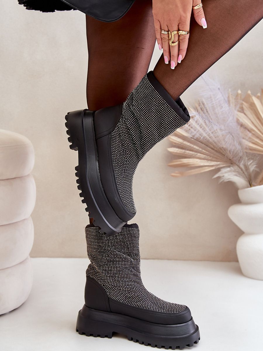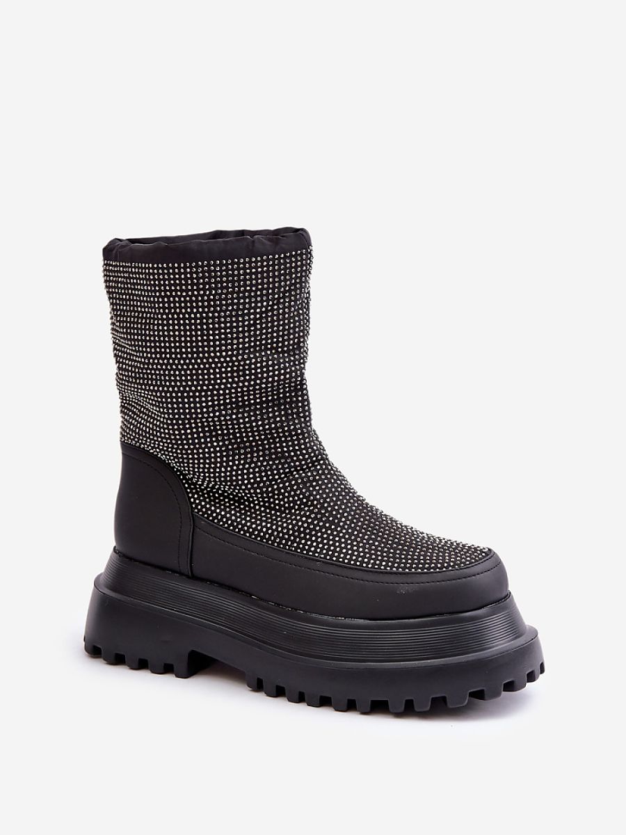 Snow boots made of materials resistant to frost and wind are an excellent choice for the most demanding winter days. Set on a platform with a flat heel, they provide stability and comfort when walking on snowy surfaces. The shiny upper with decorative details adds a fashionable, eye-catching character to them. The top of the upper is finished with a practical drawstring that effectively protects against wind and snow, providing additional warmth. These stylish snow boots perfectly combine functionality with a fashionable look, proving themselves in both urban stylizations and during winter walks.