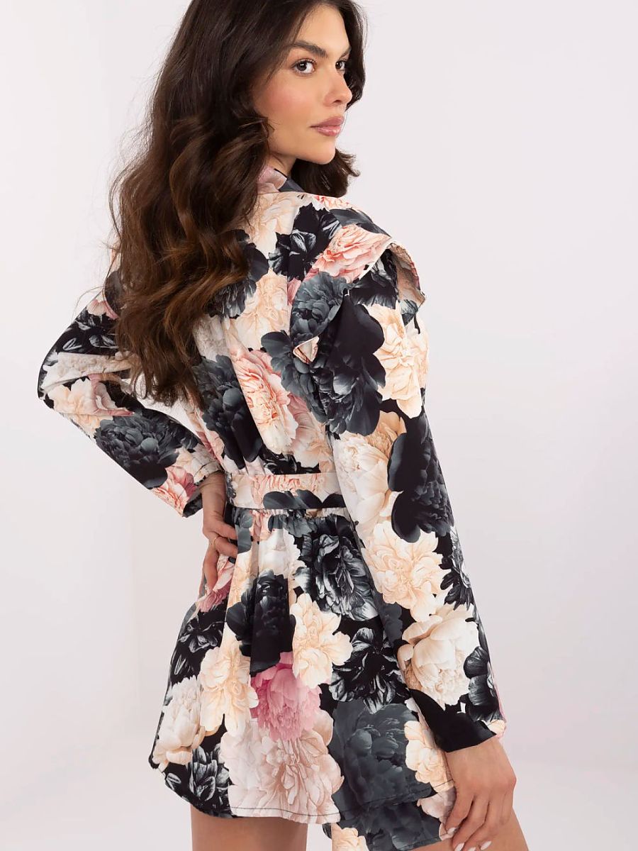 An elegant women’s jumpsuit is a stylish proposal for many occasions, perfect for work, formal meetings or parties. Made of a lightweight and pleasant to wear blend of polyester and viscose, it guarantees comfort and perfect fit to the silhouette. The trendy floral print gives it a feminine charm, and ruffles on the shoulders subtly emphasize its stylish character. The jumpsuit is mini length, which adds lightness and grace to it, while long sleeves and a classic collar introduce an elegant accent. Button closure and a belt emphasizing the waist make the whole look exceptionally elegant and feminine. This is an ideal proposal for women who appreciate the combination of classic style with modern design.