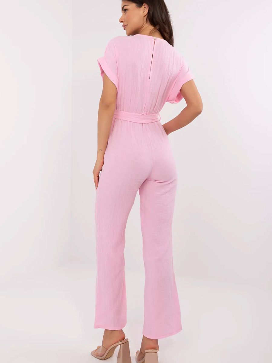 Universal, cotton jumpsuit with a smooth finish is a perfect choice for everyday wear and work. Made of breathable, natural cotton, it provides comfort and freedom of movement throughout the day. The model with short sleeves and a wrap neckline in the shape of a V subtly emphasizes the upper part of the silhouette, adding elegance to the whole. Long legs visually lengthen the silhouette, and the tie at the waist and included fabric belt beautifully accentuate the waist. Slip pockets on the sides increase functionality and add a casual character. This jumpsuit is a comfortable and stylish alternative for everyday styling, perfect for summer, the office, or more casual outings.