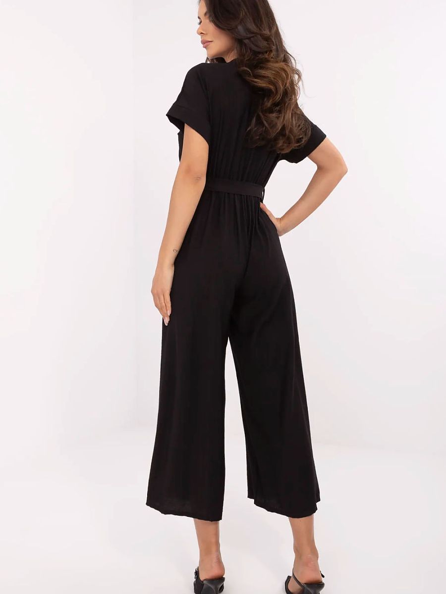 An elegant and comfortable jumpsuit with a smooth finish is a versatile option for everyday wear, work, and more formal occasions. Made from a soft, breathable blend of viscose and nylon, it provides comfort and lightness. The model with short sleeves and a wrap neckline beautifully accentuates the neckline and slims the silhouette. The long legs add elegance to the overall look, and the fabric belt at the waist allows for individual adjustment and accentuates the feminine figure. This is a stylish choice for women who appreciate classic style in a modern version, perfect for both the office and meetings or evening outings.