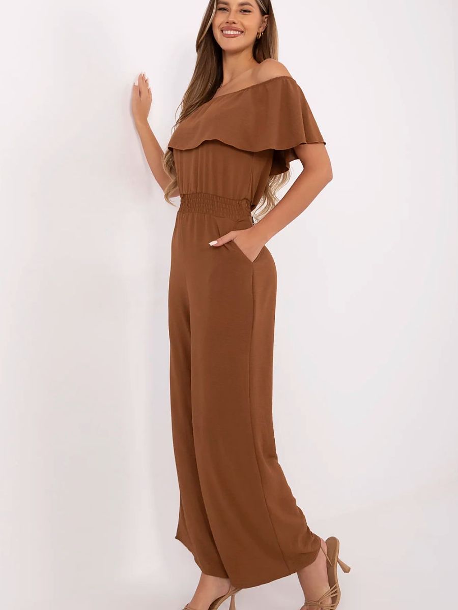 Stylish and feminine jumpsuit with a smooth finish is a universal proposal for many occasions, it will work both for everyday wear, for work, and for more formal outings. Made of a pleasant to the touch blend of viscose, polyester and elastane, it provides comfort and freedom of movement. The sleeveless model, with an impressive Spanish neckline adorned with a ruffle, subtly emphasizes the shoulders and adds a romantic character to the whole. An elastic band sewn into the waist adjusts to the silhouette and beautifully emphasizes it. Long, loosely falling legs give the jumpsuit elegance, and side slip pockets increase its functionality. The model does not have a fastening, it is put on over the head.