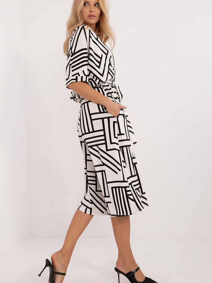 Stylish jumpsuit with a geometric pattern is the perfect choice for everyday wear, work, and special occasions. Made of lightweight, breathable fabric with a hint of elastane, it ensures comfort and freedom of movement. The model has short sleeves and a wrap neckline that subtly accentuates the neckline. Tying at the neck adds elegance, while the belt at the waist allows for an optical slimming effect. Culotte-style trousers that fall below the knee create a fashionable, modern silhouette. An additional advantage are the practical, side slip pockets. This is a feminine and functional choice for various occasions.