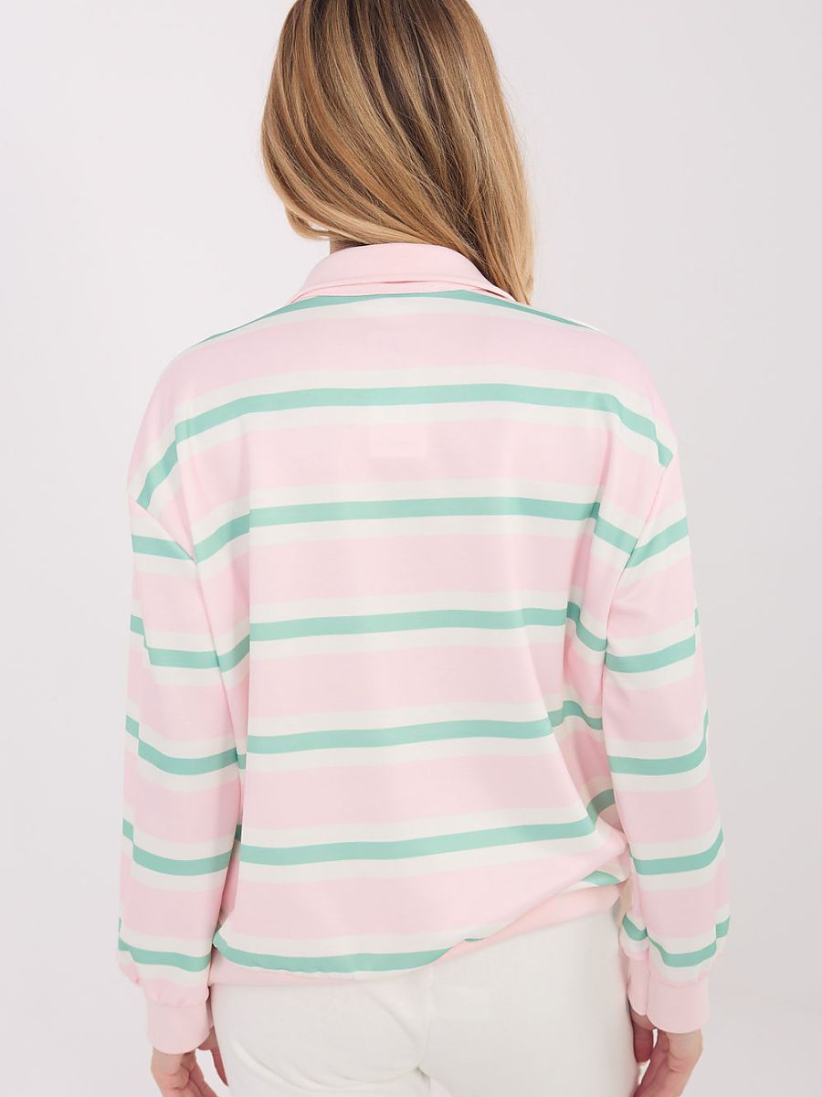A casual women’s sweatshirt with a timeless and universal style, perfect for everyday styling. The model stands out with a fashionable striped pattern, which adds freshness and a slightly sporty character to the whole. The sweatshirt is made of high-quality viscose with elastane, which ensures softness, flexibility, and high wearing comfort. The standard length cut with long sleeves fits well on the silhouette and will work throughout the season. The button closure at the front in a polo style combined with a classic collar gives the sweatshirt an elegant yet casual look. This is an excellent proposition for women who appreciate comfort combined with well-thought-out details. The sweatshirt goes well with jeans, trousers, or a skirt, creating stylish everyday outfits.