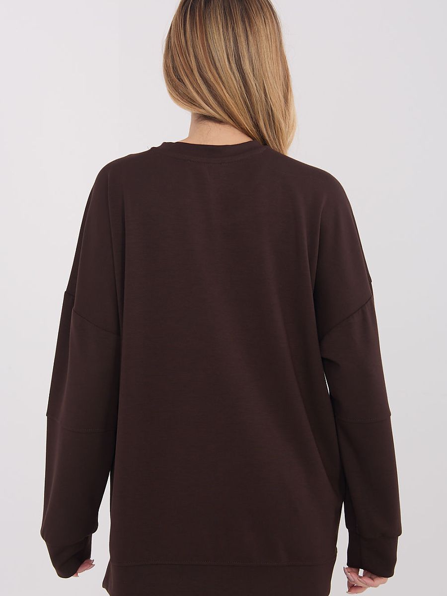 Women’s casual style sweatshirt is a comfortable and stylish proposition for everyday wear. Made of pleasant to the touch viscose with added elastane, it provides comfort, elasticity, and a good fit to the silhouette. The smooth pattern emphasizes its universal character and makes the sweatshirt blend perfectly with many wardrobe elements. The standard length with a slightly elongated back gives a modern look and subtly slims the figure. Long sleeves and a round neckline guarantee comfort and freedom of movement. The model is without fastening, complemented by a small badge at the bottom on the left side, which is a delicate, fashionable accent.