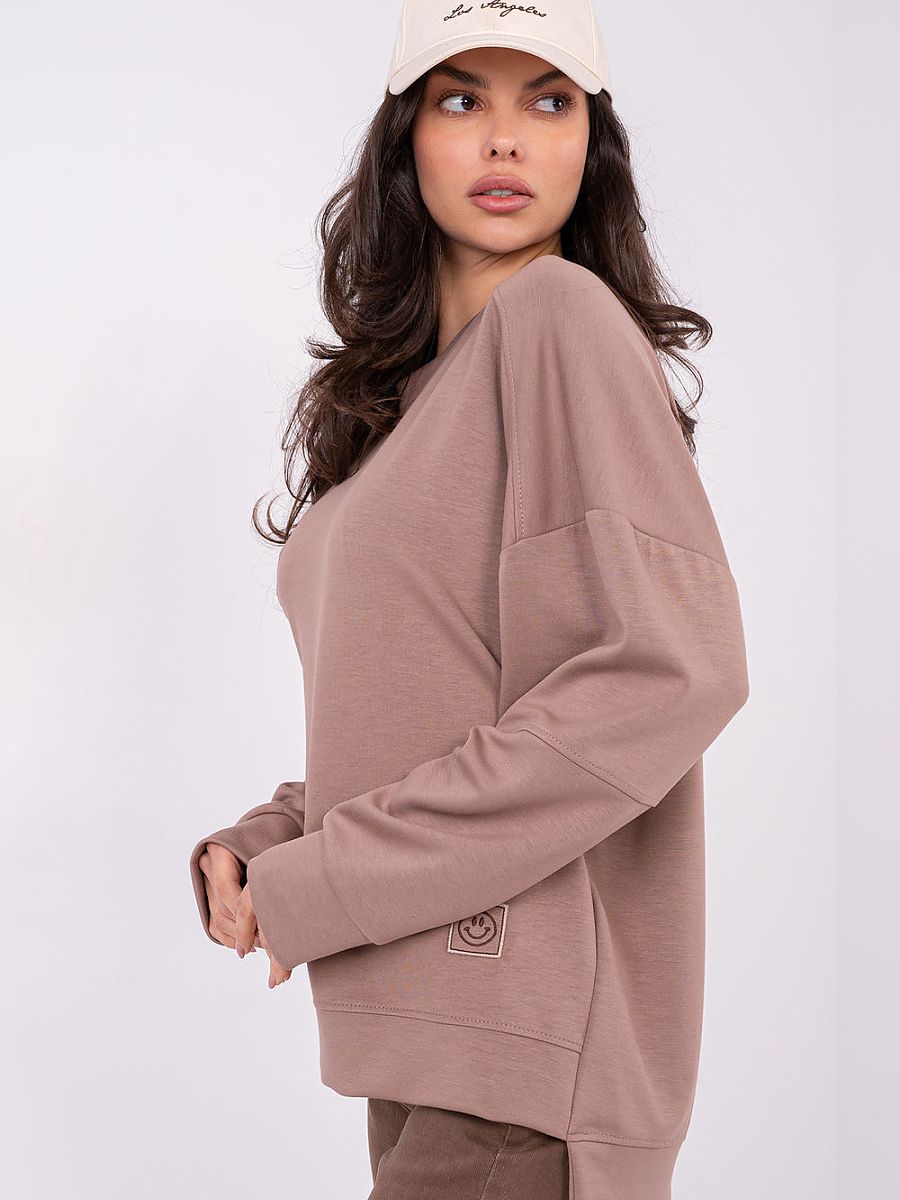 Women’s casual style sweatshirt is a comfortable and stylish choice for everyday wear. Made of soft to the touch viscose with the addition of elastane, it provides comfort, flexibility, and a good fit to the silhouette. The smooth pattern emphasizes its universal character and makes the sweatshirt perfectly match with many wardrobe elements. Standard length with a slightly elongated back gives a modern look and subtly slims the figure. Long sleeves and a round neckline guarantee comfort and freedom of movement. Model without a fastening, complemented by a small patch at the bottom on the left side, which is a delicate, fashionable accent.