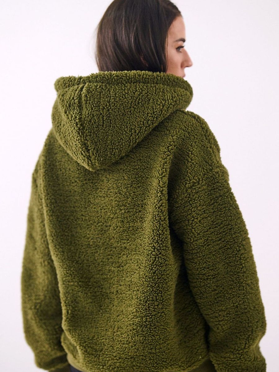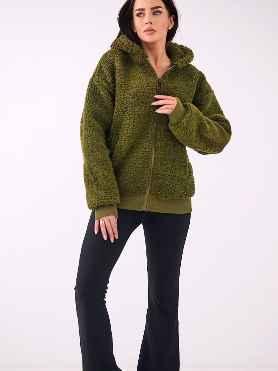 Casual women’s sweatshirt in the “sheep” style is the perfect choice for everyday wear on cooler days. Made of soft and pleasant to the touch polyester, it provides comfort and a pleasant feeling of warmth. A model of standard length with long sleeves, equipped with a practical hood protecting against wind and cold. The sweatshirt is fastened with a zipper, which increases comfort of use and allows for easy styling. Additional advantages are ribbing at the bottom and sleeves, which improve fit and prevent heat loss. The smooth pattern gives the sweatshirt a universal character, and the slip pockets are a functional addition for small items or warming hands. Perfect for everyday, casual outfits.
