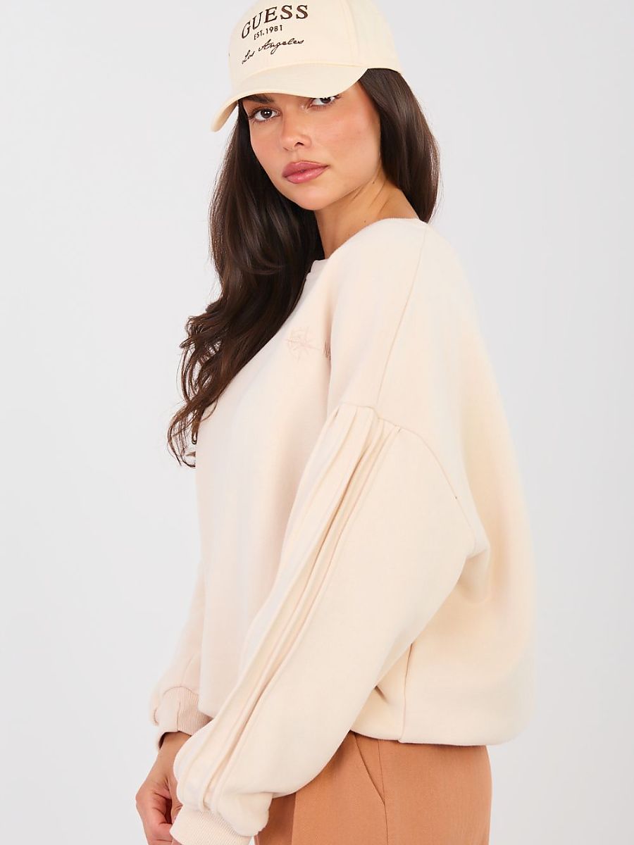 Women’s casual sweatshirt is an excellent everyday proposition, combining comfort with subtle details. Made of high-quality cotton with elastane, it is soft, elastic, and pleasant to wear, while also fitting well to the silhouette. The standard length model has a round neckline and long sleeves decorated with decorative stitching, giving the sweatshirt a modern and original character. The lack of fastening emphasizes the minimalist cut and ensures maximum comfort of use. The smooth pattern makes the sweatshirt extremely versatile, while a small embroidery placed at chest height on the left side adds a delicate, feminine accent that subtly distinguishes the model. Perfect for everyday styling, it pairs well with jeans, sweatpants, or leggings.