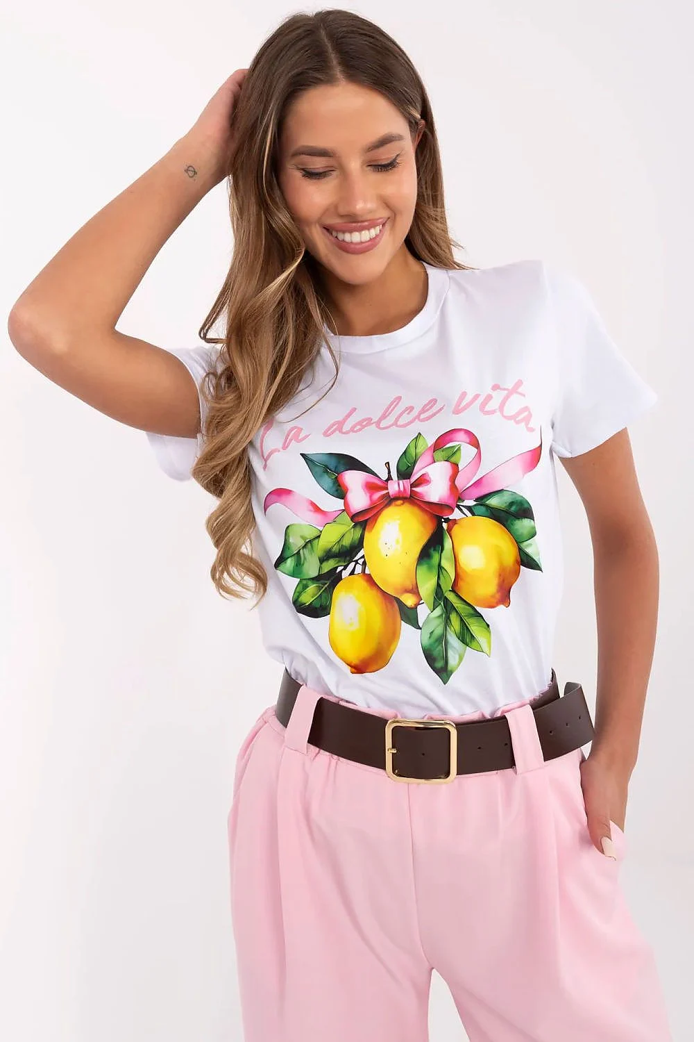 Casual women’s t-shirt is a perfect choice for everyday wear. Made of soft and breathable cotton with a touch of elastane, it provides comfort and freedom of movement. The classic cut with a standard length perfectly fits the silhouette. It has a round neckline and short sleeves, making it a versatile wardrobe piece. The trendy print with lettering on the front adds original character to it. It will work great in casual stylizations, both with jeans and skirts.