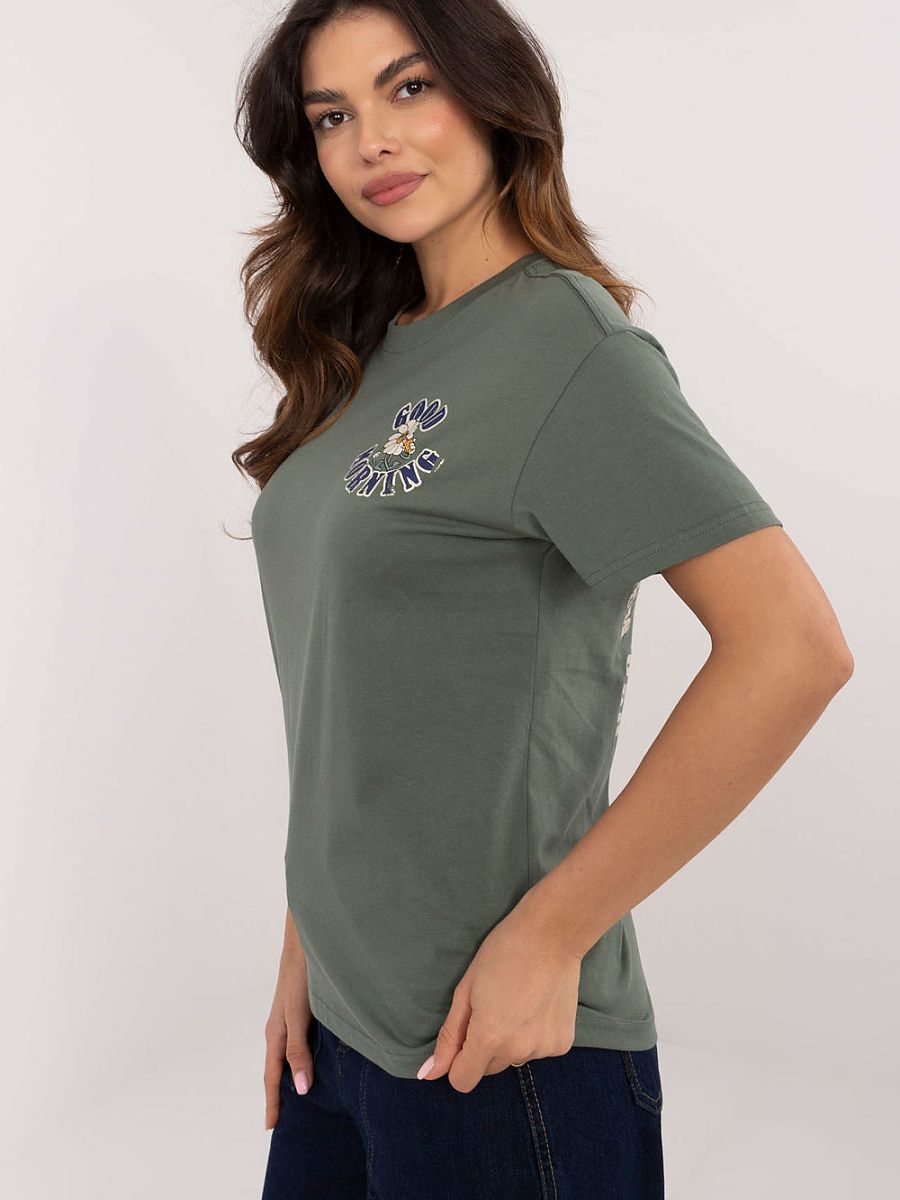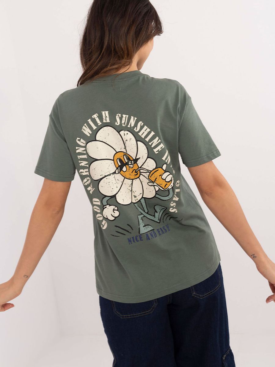 Women’s t-shirt in a classic cut, made of high-quality cotton, ensuring comfort when worn. The front is adorned with a subtle print with a slogan, giving the shirt a fashionable, minimalist character. The back features a decorative print combined with dynamic slogans, adding an original expression to the whole. A model of standard length, with short sleeves and a round neckline, will work perfectly in everyday stylizations. An ideal choice for women who value comfort and style in one.