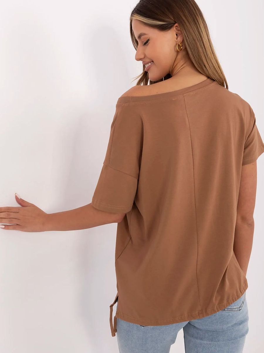 Add a touch of brightness to your everyday outfits with this unique casual women’s t-shirt. Made of soft cotton with a hint of elastane, it ensures comfort and a light fit to the silhouette. The standard length shirt with short sleeves and a round neckline is perfect for everyday wear, work, a walk, or a meeting with friends. Its unique character is emphasized by the eye-catching application on the front, combining print, embroidery, and rhinestones, giving the whole a fashionable and feminine look. An additional accent is the tie on the left side at the bottom, which adds lightness and subtle originality. This t-shirt is the perfect combination of comfort and style, it must not be missing from your wardrobe!