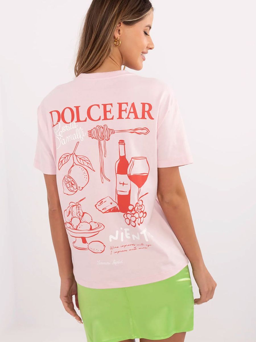Women’s casual T-shirt is a universal proposition for everyday wear. Made of high-quality cotton, it provides comfort and freedom of movement throughout the day. The model is of standard length, with a classic round neckline and short sleeves. A subtle, small print on the front adds a delicate accent, while the back attracts attention with a bold print with inscriptions. Perfect for jeans, shorts or skirts, it will work great in urban, casual stylizations.