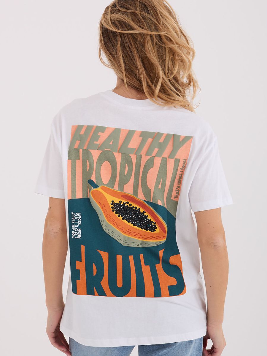 Women’s t-shirt made of breathable, high-quality cotton, perfect for everyday casual styling. The standard length model with short sleeves ensures comfort all day long. The round neckline gives a classic, universal character, making the shirt perfect both solo and paired with a sweater or jacket. At chest height, there is a prominent inscription that is the dominant element of the design, emphasizing a modern, urban style. Additionally, there are inscriptions and prints on the back, creating an impressive graphic composition. This is an excellent choice for women who appreciate comfort and a fashionable look in any situation.