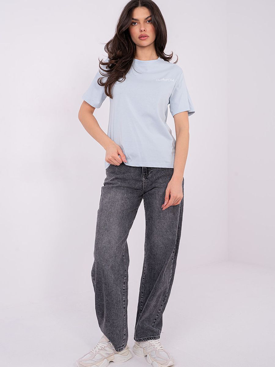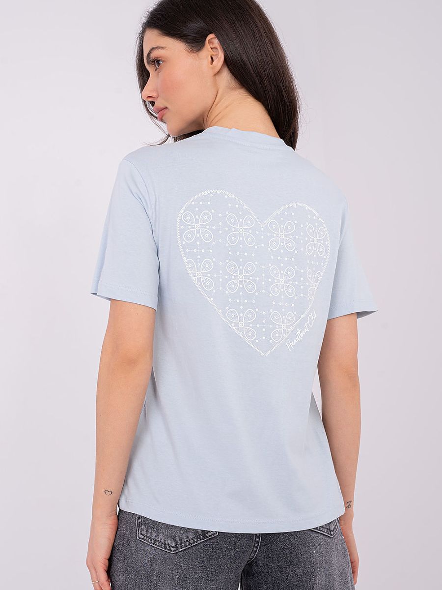The women’s casual T-shirt is a comfortable and stylish option for everyday wear. Made of high-quality cotton, it provides comfort, breathability, and a natural fit to the silhouette. The smooth base of the shirt has been decorated with a subtle, small inscription on the front and a large print on the back, giving it a modern and distinctive character. The model is of standard length, with short sleeves and a classic round neckline, perfect for everyday styling, creating a fashionable and casual look.