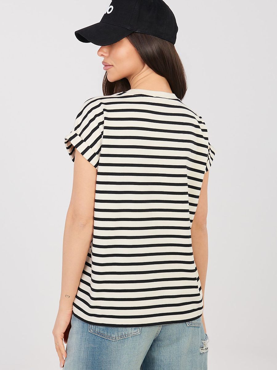Women’s T-shirt of standard length, made of thick, high-quality cotton that ensures durability and comfort throughout the day. The natural, breathable material makes the shirt perfect for everyday stylizations, regardless of the season. The model maintained in a casual style stands out with a dominant striped pattern, which gives it a timeless character. Short sleeves and a classic, round neckline emphasize the universal cut and make the T-shirt look great with both jeans, skirts, or shorts. This is an ideal proposition for women who value comfort, simplicity, and timeless design.