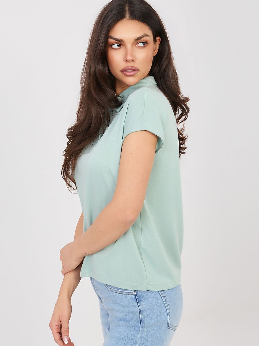 Ladies’ polo T-shirt of standard length is a perfect combination of comfort and timeless style. The model fastened with three buttons allows you to adjust the neckline and gives the whole a subtly sporty character. The classic collar emphasizes the elegant yet casual look. The shirt is kept in a casual style, making it perfect for everyday wear to work, for a walk or a meeting with friends. The smooth, minimalist pattern makes it a versatile base for many stylizations. Made of a combination of viscose and polyester, it provides pleasant softness, lightness and good durability of the material. Short sleeves and a comfortable cut guarantee comfort throughout the day. It is the perfect choice for women who appreciate simplicity, functionality and classic style in a modern version.