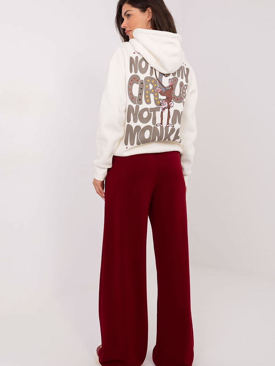 Sweatpants in a casual style, perfect for everyday wear. Made of a soft blend of viscose, polyester, and elastane, they provide comfort, breathability, and a slight flexibility of the material. The smooth texture of the fabric gives them a universal character, making them easy to match with many different outfits. The model stands out with a high waist and wide legs that beautifully flow with movement, emphasizing the relaxed fit. The practical tie at the waist allows for adjustment to the silhouette, while the side slip pockets add functionality. Modern and comfortable, a great choice for everyday casual sets.