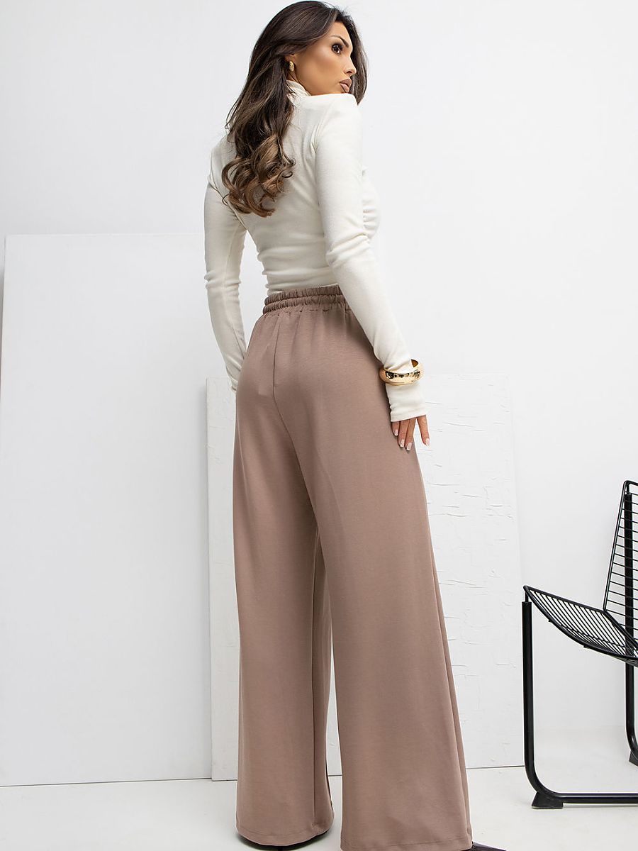 Soft palazzo-style sweatpants made of incredibly delicate, elastic, and exceptionally pleasant to the touch buttery material. Thanks to the high waist and wide legs, the model beautifully fits on the silhouette, providing full comfort while wearing. On the front, there are subtle, decorative seams that add an elegant character to the pants and visually elongate the legs. The waist features a comfortable tie, allowing for a perfect fit to the figure, while the side slip pockets emphasize the casual style and functionality of the model. The smooth material with a hint of elastane and predominantly viscose makes the pants breathable, elastic, and perfect for everyday styling, both for work and leisure. An ideal choice for those who value comfort combined with a modern, minimalist style.