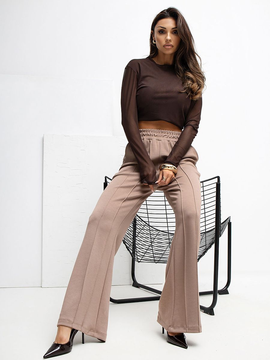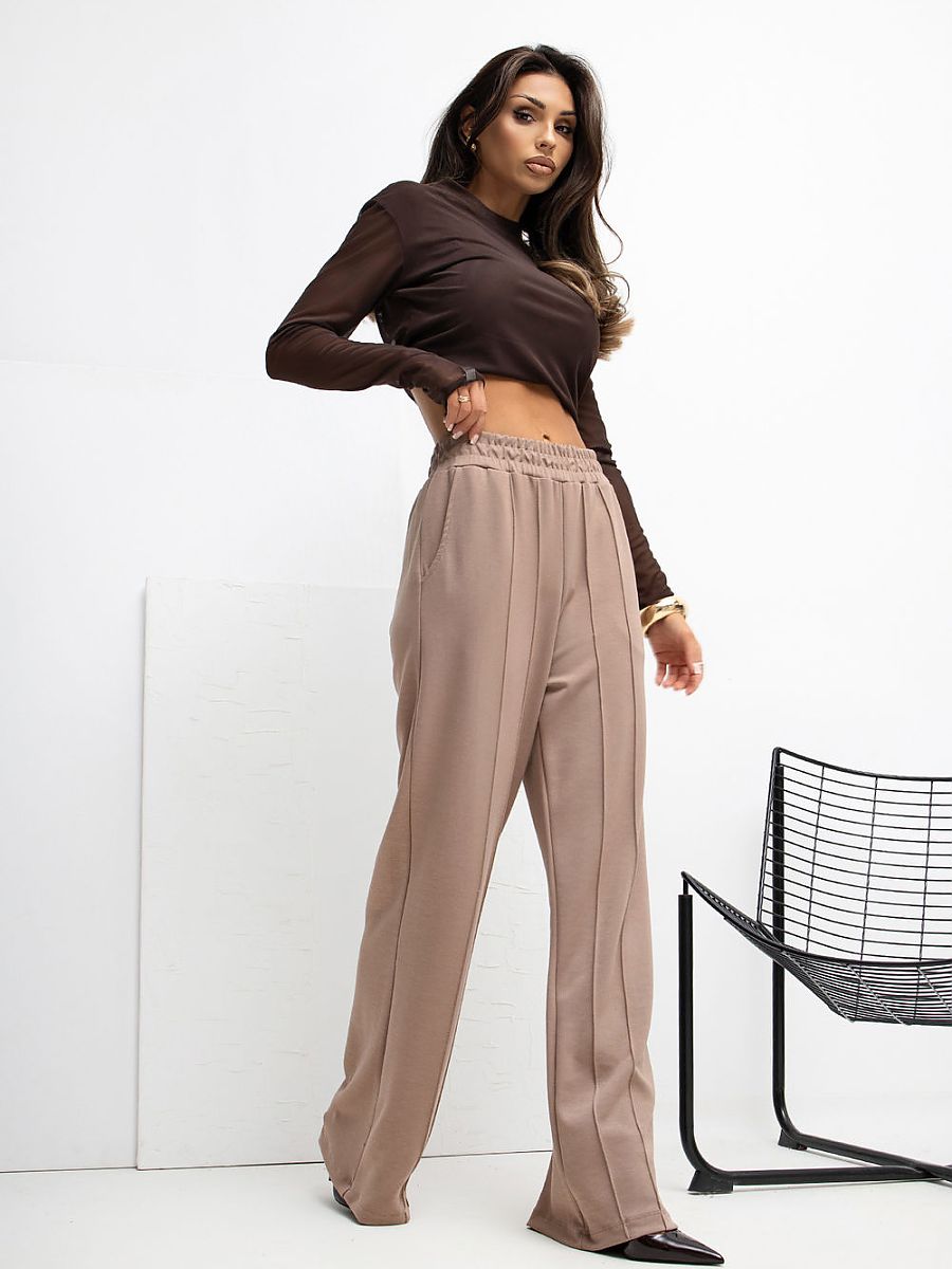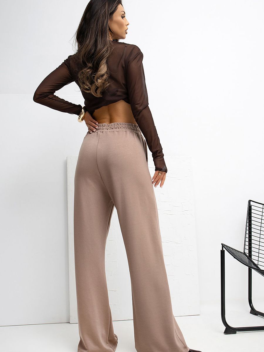 Extremely comfortable sweatpants made of buttery material, extremely soft, delicate and exceptionally pleasant to the touch. Thanks to the blend of viscose and elastane, the pants are elastic, lightweight and perfectly fit the silhouette, providing maximum comfort for everyday wear. The wide leg cut model delights with wide legs, which guarantee freedom of movement and a modern look. The high waist with an elastic band ensures a perfect fit and comfort, and the lack of fastening makes it easy and quick to put on the pants. The dominant smooth pattern gives them a minimalist character, and the side slip pockets add functionality without disturbing the simple line of the cut. Perfect for women who appreciate comfort, softness, and a modern, casual style.