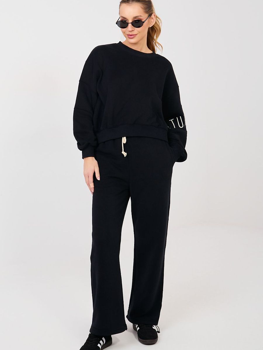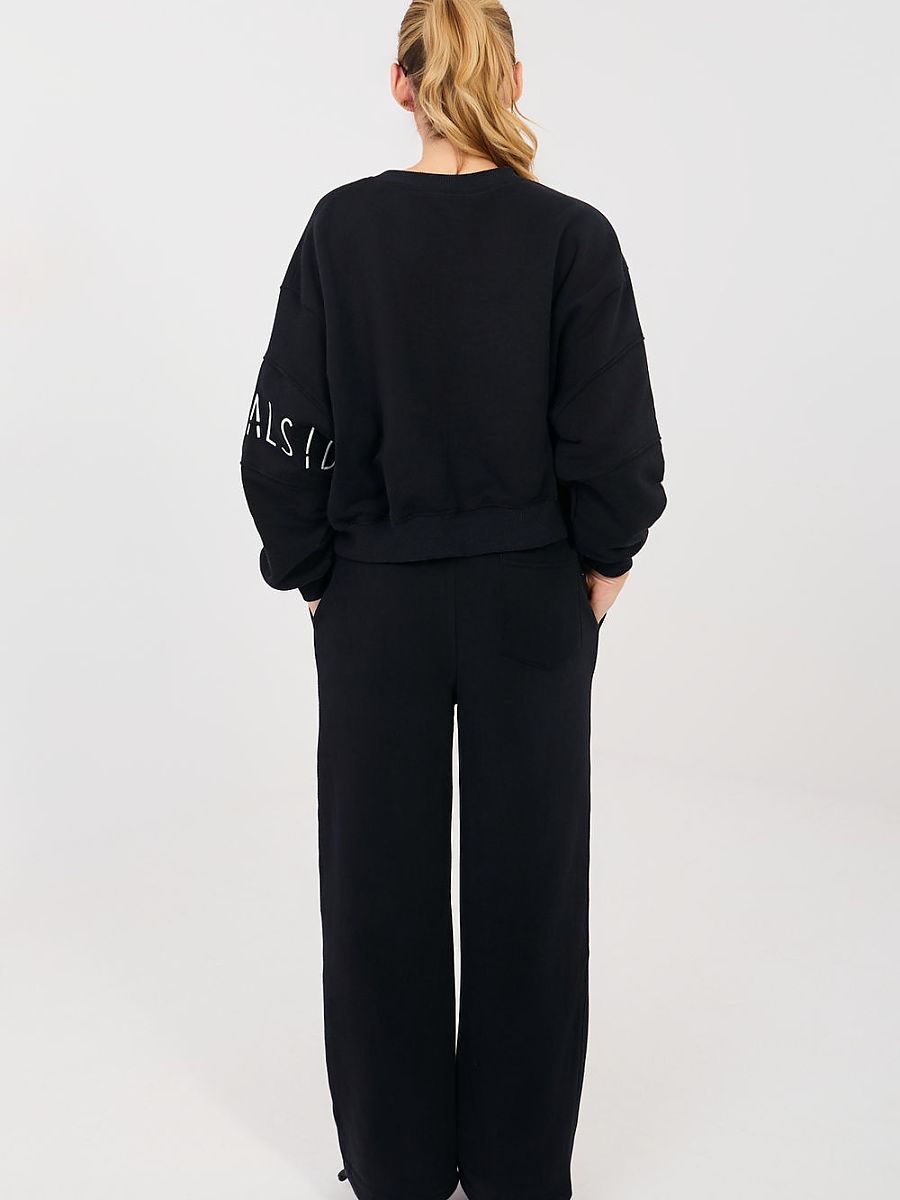 Straight leg sweatpants are a comfortable and stylish proposition in a casual edition. They will work perfectly for everyday wear, both during relaxation, walks, and in urban stylizations. The straight legs give them a modern, minimalist character and ensure freedom of movement. The model is made of high-quality cotton and polyester blend, guaranteeing comfort, softness, and material durability. The high waist beautifully emphasizes the waist and ensures a comfortable fit to the silhouette. There is a practical tie at the waist for individual adjustment. The pants have side slip pockets, increasing the functionality of the model. The smooth pattern emphasizes their universal style, while the decorative embroidery on the left leg is a subtle, fashionable accent that gives the whole a unique character.