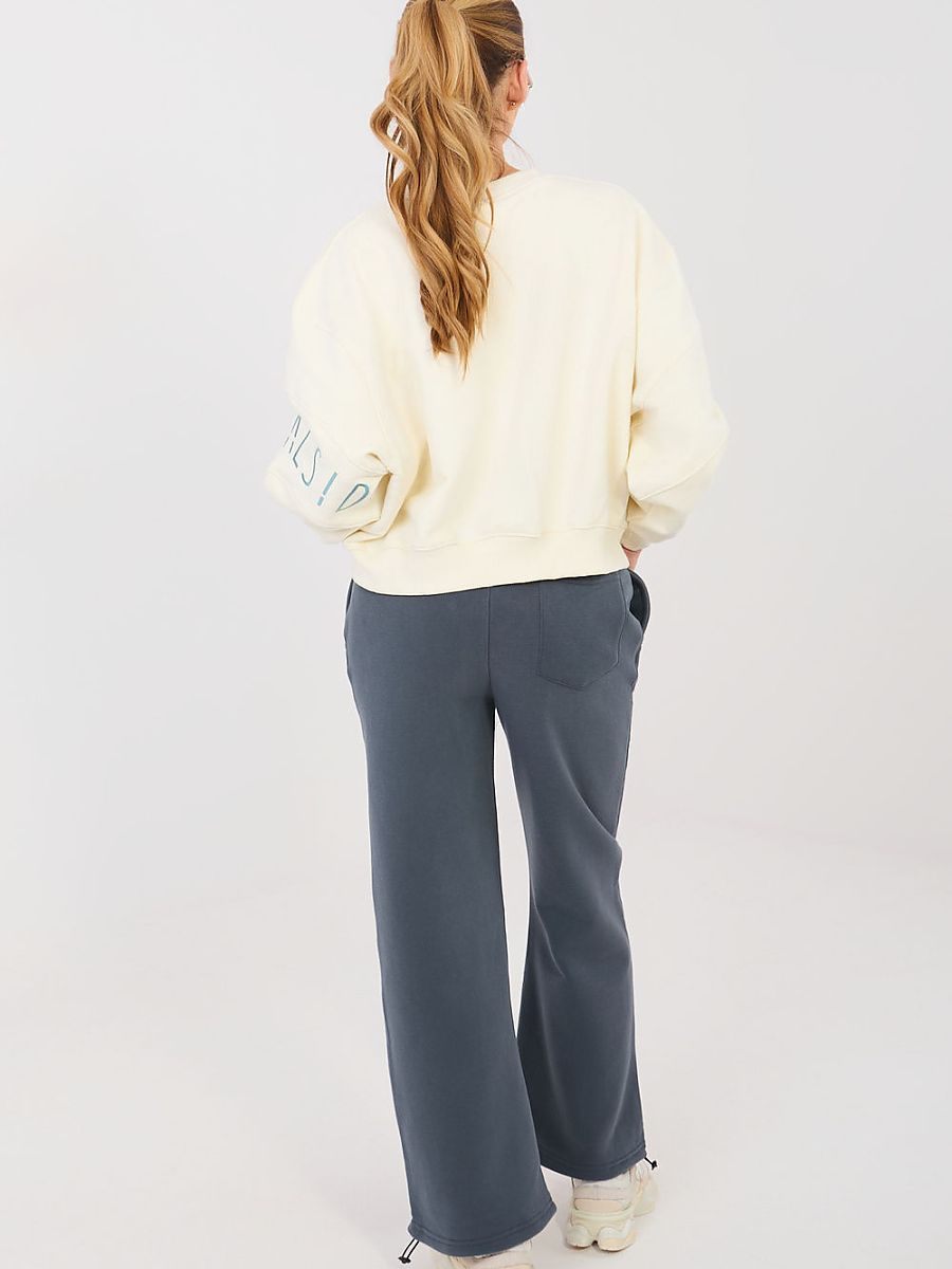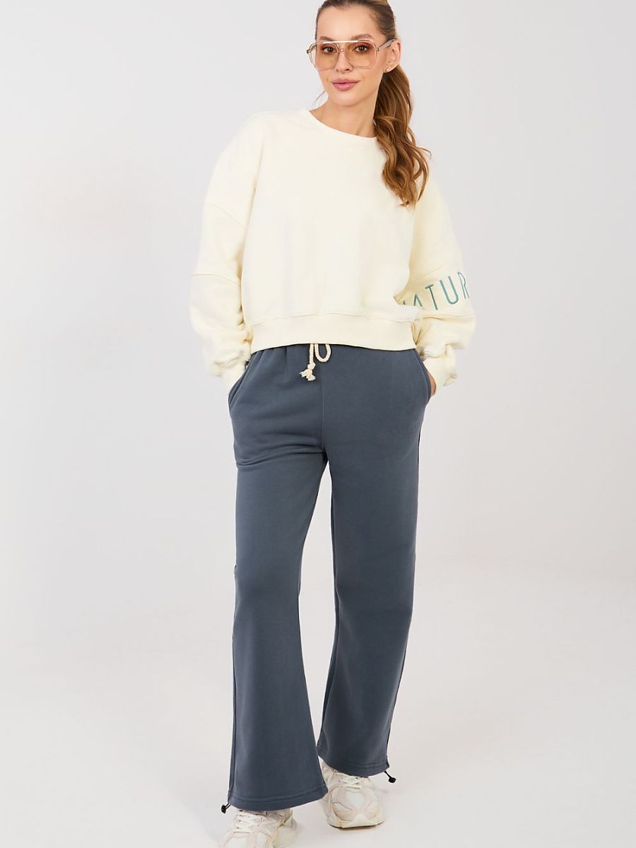 Sweatpants with straight leg are a comfortable and stylish option in a casual edition. They will work perfectly for everyday wear, both for relaxation, walks, and urban stylizations. The straight legs give them a modern, minimalist character and ensure freedom of movement. The model is made of high-quality cotton and polyester blend, which guarantees comfort, softness, and material durability. The high waist beautifully emphasizes the waist and ensures a comfortable fit to the silhouette. There is a practical tie in the waist for individual adjustment. The pants have side pockets, increasing the functionality of the model. The smooth pattern emphasizes their universal style, while the decorative embroidery on the left leg is a subtle, fashionable accent that gives the whole a unique character.