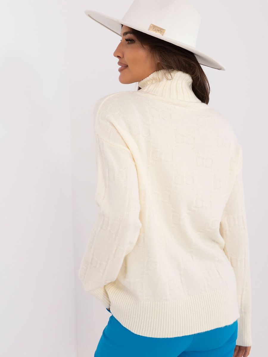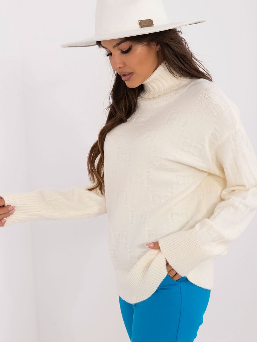 Women’s turtleneck sweater, perfect for everyday casual occasions. Made of material with varied texture, which adds to its unique character. The dominant material is a blend of acrylic, polyester, and polyamide, which ensures durability and comfort when wearing. The sweater has a standard length and long sleeves, making it a universal choice for cooler days.