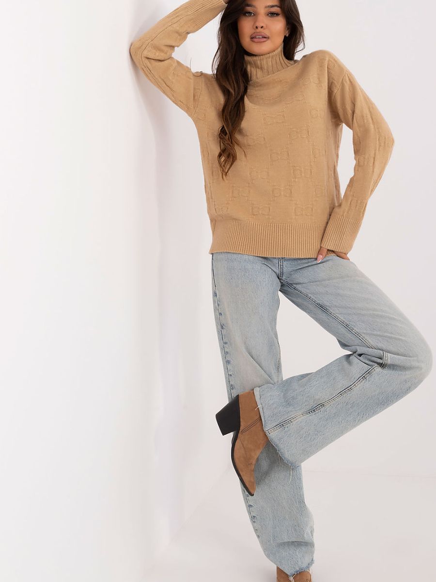Women’s turtleneck sweater, perfect for everyday casual occasions. Made of material with a varied texture, which gives it a unique character. The dominant material is a blend of acrylic, polyester and polyamide, which ensures durability and comfort when wearing. The sweater has a standard length and long sleeves, making it a universal choice for cooler days.