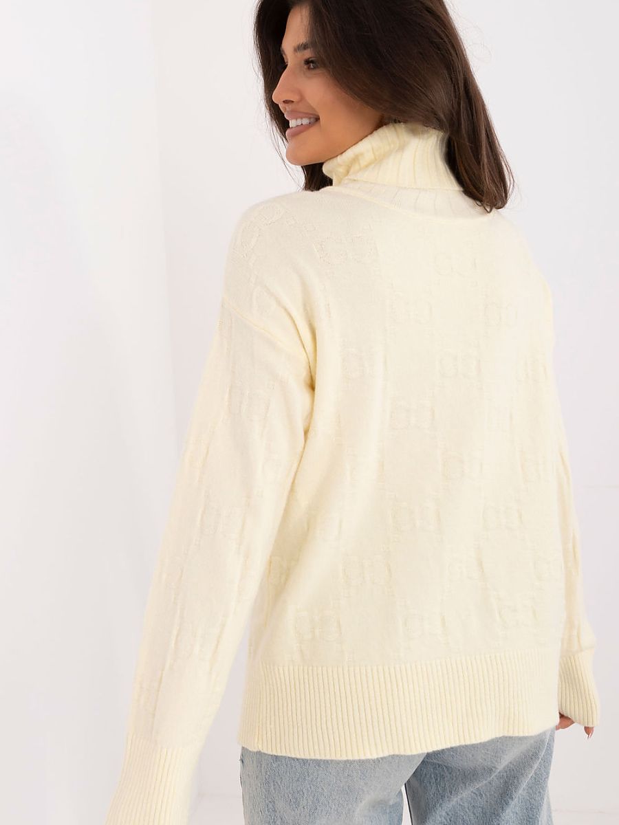 Women’s turtleneck sweater, perfect for everyday casual occasions. Made from a material with varied texture, which gives it a unique character. The dominant material is a blend of acrylic, polyester, and polyamide, which ensures durability and comfort when wearing. The sweater has a standard length and long sleeves, making it a versatile choice for colder days.