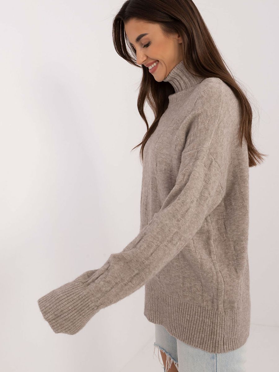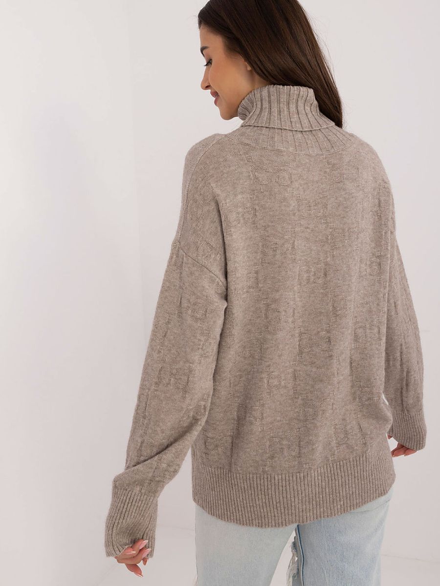 Women’s turtleneck sweater, perfect for casual everyday occasions. Made of material with a varied texture, which gives it a unique character. The dominant material is a blend of acrylic, polyester and polyamide, which ensures durability and comfort. The sweater has a standard length and long sleeves, making it a versatile choice for cooler days.