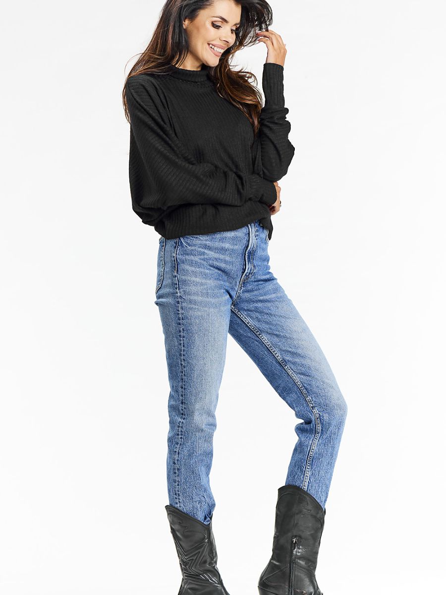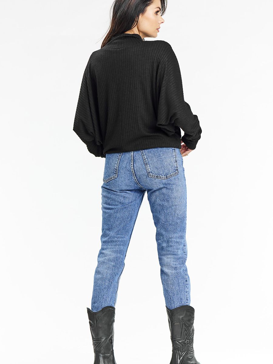 Knit turtleneck sweater in ribbed knit. Discover elegance and comfort in our loose-fitting kimono turtleneck sweater in black. Perfect for fall and winter, it combines casual style with subtle elegance. The loose turtleneck provides warmth, while the kimono sleeves add a modern look to the sweater. Made of soft ribbed knit fabric, it provides comfort and durability. The sweater sits perfectly on the figure, offering an elegant and comfortable look. Perfect for everyday wear, for work or meetings with friends. It goes well with jeans, boots and boots, creating stylish autumn-winter styling.