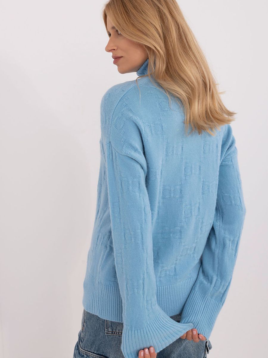 Women’s turtleneck sweater, perfect for everyday casual occasions. Made of material with a varied texture, which gives it a unique character. The dominant materials are a blend of acrylic, polyester, and polyamide, which ensures durability and comfort when wearing. The sweater has a standard length and long sleeves, making it a versatile choice for colder days.
