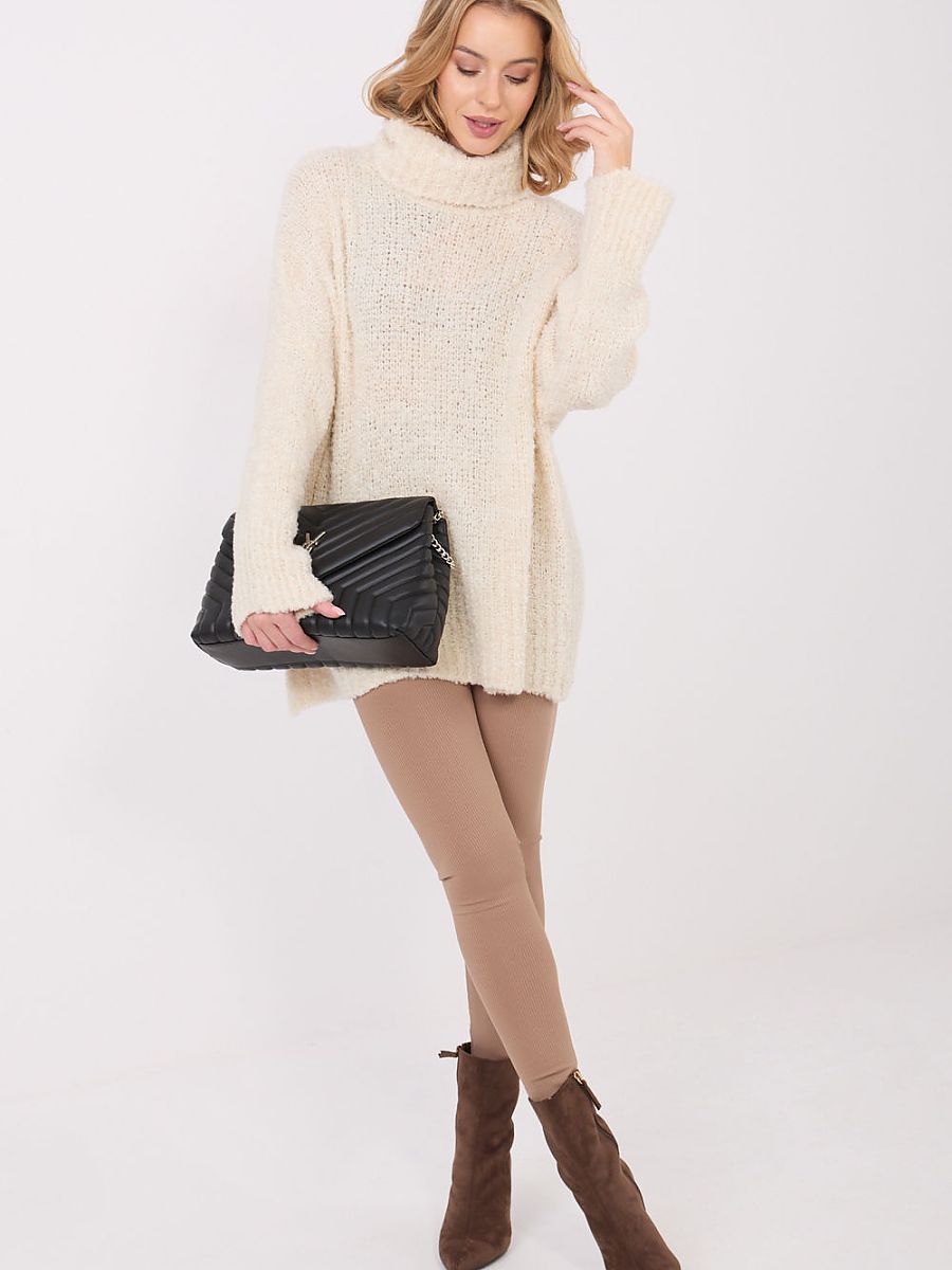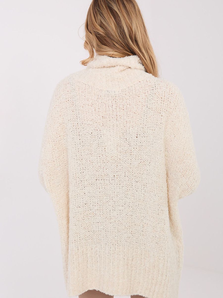 Women’s boucle sweater with a turtleneck is a stylish and comfortable option for everyday styling. The characteristic looped structure of the material gives it a fashionable, cozy look, perfect for colder days. Made of high-quality blend of acrylic, wool, viscose, and polyamide, it provides warmth, softness, and durability. The long-length model with long sleeves perfectly envelops the silhouette and guarantees comfort when worn. The turtleneck effectively protects against the cold, and the lack of fastening emphasizes the simple, casual character of the sweater. The smooth pattern makes it a versatile wardrobe piece that pairs well with both jeans, leggings, or a skirt.