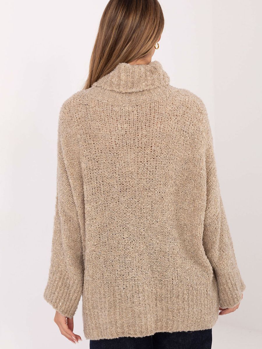 Women’s boucle sweater with a turtleneck is a stylish and comfortable choice for everyday styling. The characteristic, looped structure of the material gives it a fashionable, cozy look, perfect for cooler days. Made of high-quality blend of acrylic, wool, viscose, and polyamide, it provides warmth, softness, and durability. The long-length model with long sleeves perfectly envelops the silhouette and guarantees wearing comfort. The turtleneck effectively protects against the cold, and the lack of fastening emphasizes the simple, casual character of the sweater. The smooth pattern makes it a versatile wardrobe item that pairs well with both jeans, leggings, or a skirt.