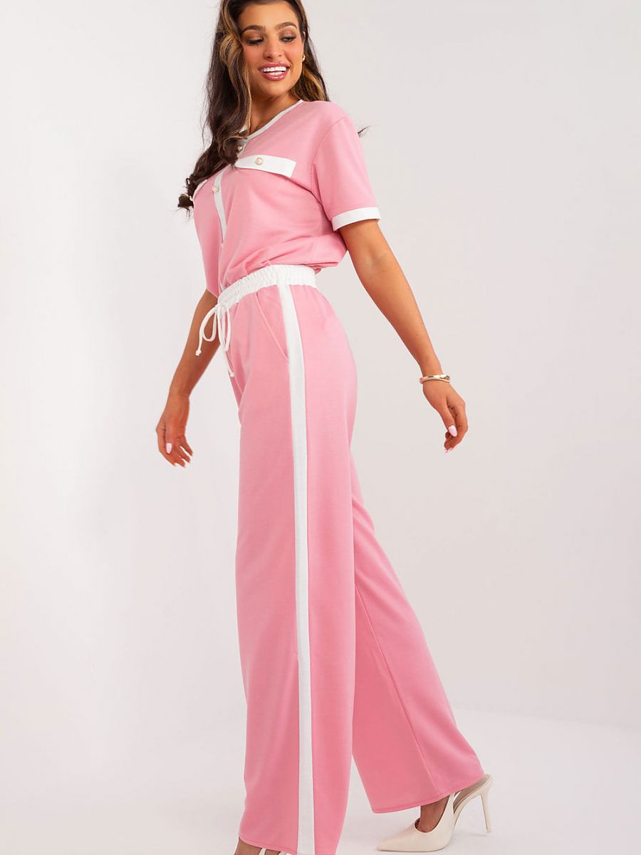 Pants with a simple, casual style, ideal for everyday wear. Made of smooth material, they provide comfort and freedom of movement throughout the day. Contrasting inserts on the sides of the legs add character and freshness, giving them a unique look. The belt in a contrasting color gives the pants a subtle but distinctive touch that sets them apart from other garments. The high rise guarantees a perfect fit and comfortable wear, while emphasizing the silhouette. Straight legs give them versatility, matching both everyday and more elegant outfits. The waist tie allows you to adjust the fit, ensuring optimal wearing comfort. In addition, the slip-in side pockets are a practical feature, allowing you to keep small items within easy reach. These pants are mainly made of cotton, which guarantees natural skin breathability and a pleasant wearing experience. Their versatile design makes them an ideal choice for many different occasions.