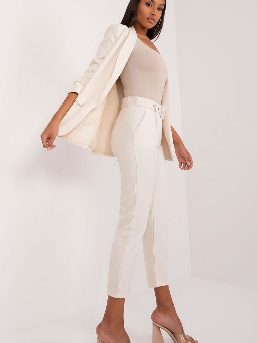 Elegant chino pants made of smooth material dominated by polyester. They are perfect for various occasions, both for everyday wear, for work, and for more formal visits. Thanks to their high waist, they provide comfort and a stylish look. Straight legs add a classic character, and the zip and button closure ensures ease of use. Additionally, they are equipped with a fastened belt and practical slip pockets, making them not only aesthetic but also functional wardrobe item.