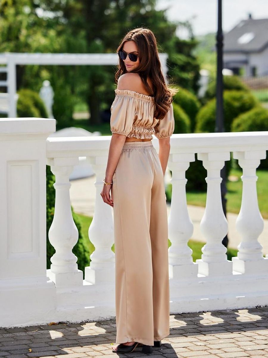Tarifa satin pants are comfort, functionality and excellent style in one. The pants are made of elegant satin fabric that will add chic and class to your styling. The waistband features an elastic band with a crease for a perfect fit and emphasis around the waist. Wide, gently flared legs elongate the legs and guarantee comfortable wear. The pants have side open pockets, which are a functional as well as a decorative addition. Tarifa pants create a perfect styling when paired with our Marbella blouse, but also with a classic top or plain shirt, which you are sure to have in your closet. Match them with delicate jewelry or opt for a distinctive necklace and stiletto sandals. The pants are perfect for elegant styling and for important occasions such as communion, baptism and birthdays. You can also create a chic, modern styling for a wedding by replacing the classic dress with our satin top plus pants set. The product is made and sewn in Poland.