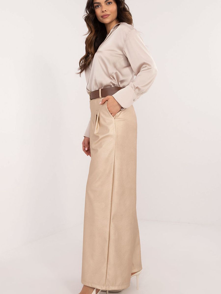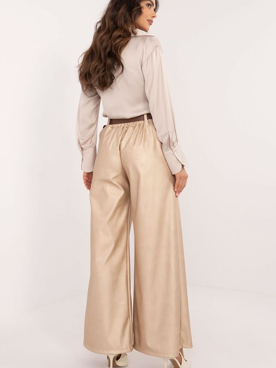 Eco leather pants are an excellent choice for women who want to combine elegance with everyday comfort. Ideal for work as well as everyday wear, these pants are distinguished by a minimalist, smooth design that is easy to match with different styles. Made of high quality polyester and viscose, they provide not only a stylish look, but also a comfortable fit. The high rise with sewn-in elastic at the back guarantees a perfect fit and comfort, while the wide legs give the pants a modern, fashionable character. The lack of a fastener makes them extremely easy to put on, and practical, slip-in side pockets add functionality. In addition, the buckled waistband allows for an even better fit at the waist. These insulated pants will be the perfect choice for colder days, combining elegance with everyday comfort and modern style.