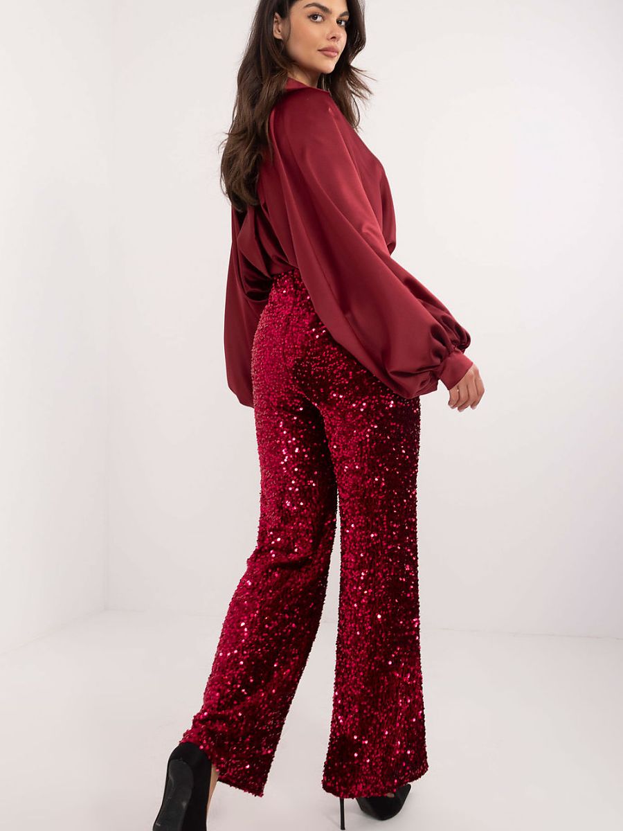 Elegant material trousers with sequins, designed for special occasions such as formal outings and parties. Made of a combination of polyester and elastane, the trousers provide a comfortable fit and a delicate shine thanks to the sequin application, which adds depth to them. The model with straight legs and a high waist subtly lengthens the silhouette. The lack of fastening and pockets gives the whole a smooth, minimalist look, and the delicate lining ensures comfort when wearing. These trousers are the perfect choice when you want to add an elegant, eye-catching accent to your outfit.