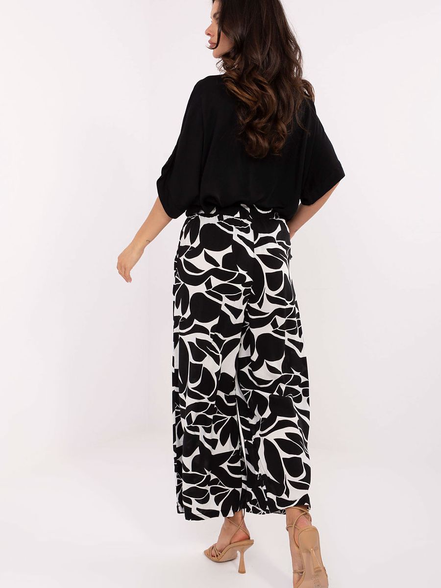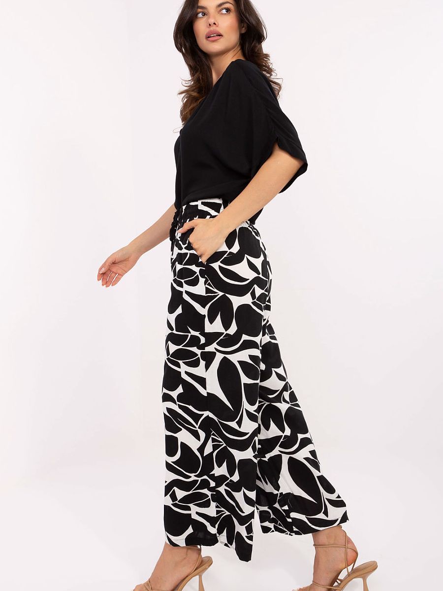 Light and comfortable women’s casual trousers are the perfect choice for everyday styling. Made of breathable, skin-friendly viscose, belonging to the category of eco-friendly clothing, they combine wearing comfort with care for the environment. The high waist and tie at the waist ensure a great fit and emphasize the waist, while the wide legs give the silhouette lightness. The decorative print adds character, and the side slip pockets increase functionality. This is an excellent proposition for women who appreciate style, comfort, and conscious choices.