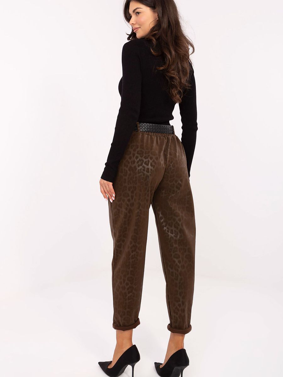 Women’s faux leather pants in a casual style, perfect for everyday wear. Made from a blend of viscose, nylon, and elastane, they combine comfort with elasticity and durability. The high-waisted model with tapered legs and an elastic waistband provides comfort and a stylish, fitted silhouette, while the fastened belt emphasizes the waist. Side slip pockets and a trendy leopard print motif give the pants a bold, modern character.