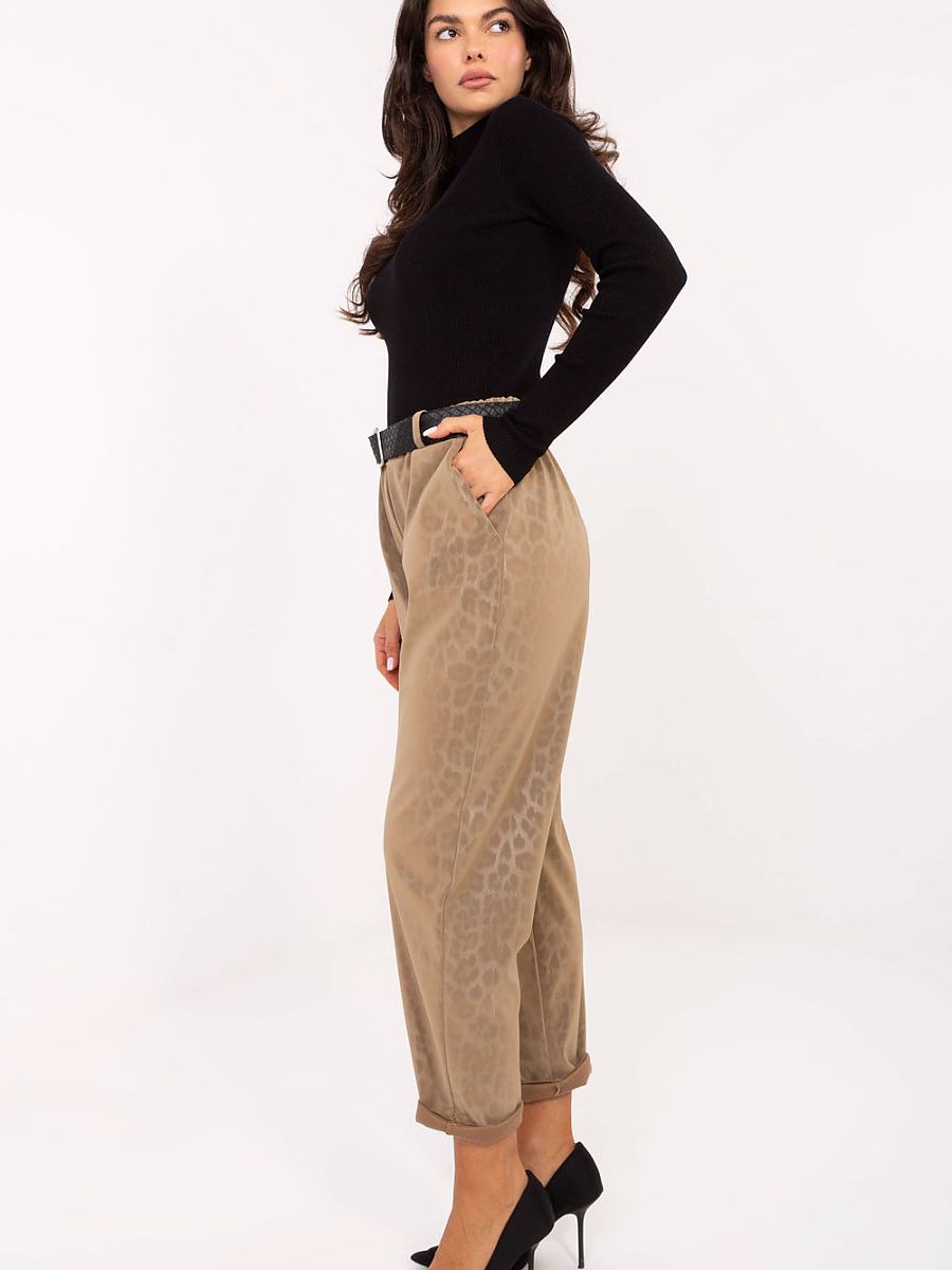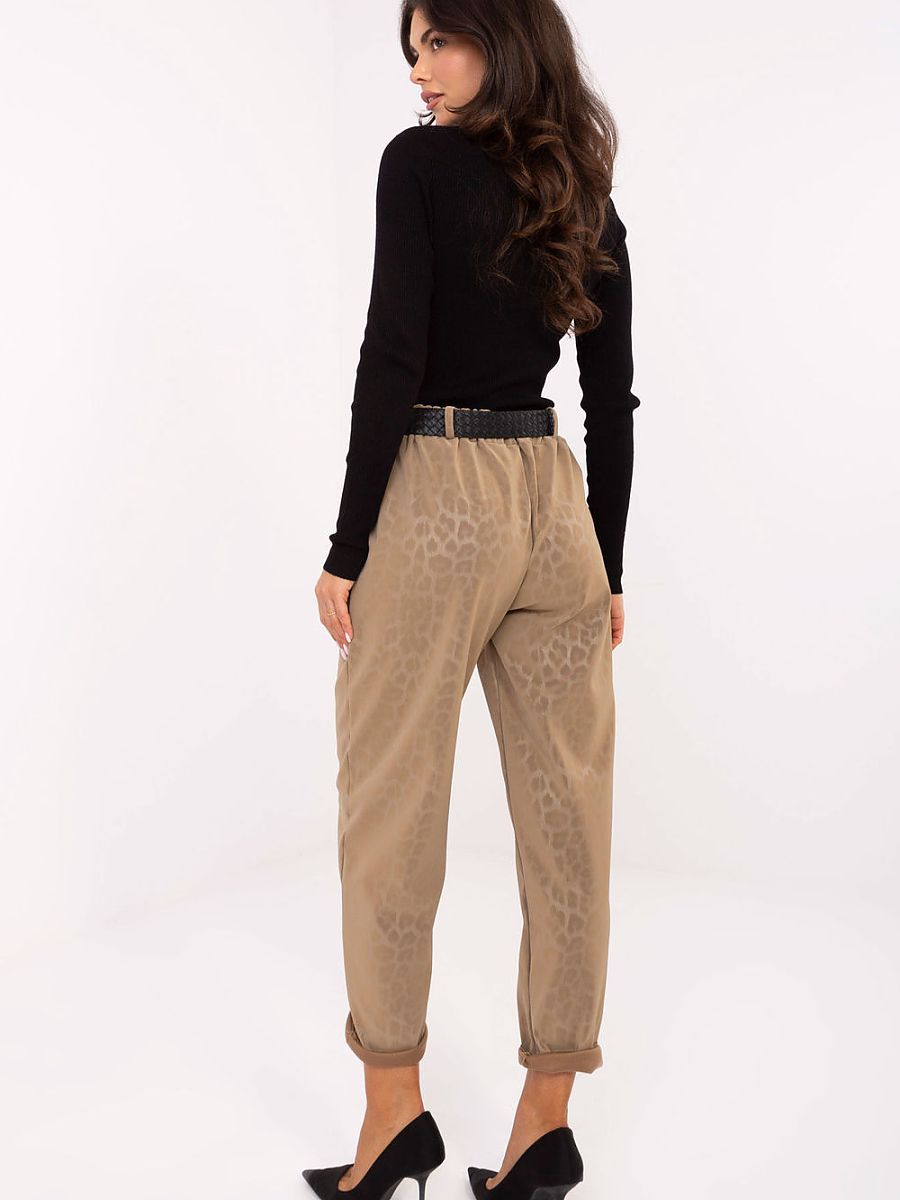 Women’s eco-leather pants in a casual style, perfect for everyday wear. Made from a blend of viscose, nylon, and elastane, they combine comfort with flexibility and durability. The high-waisted model with tapered legs and an elastic waistband provides comfort and a stylish, tailored fit, while the fastening belt highlights the waist. Side slip pockets and a trendy leopard print motif give the pants a distinctive, modern character.