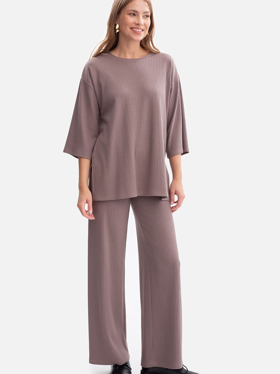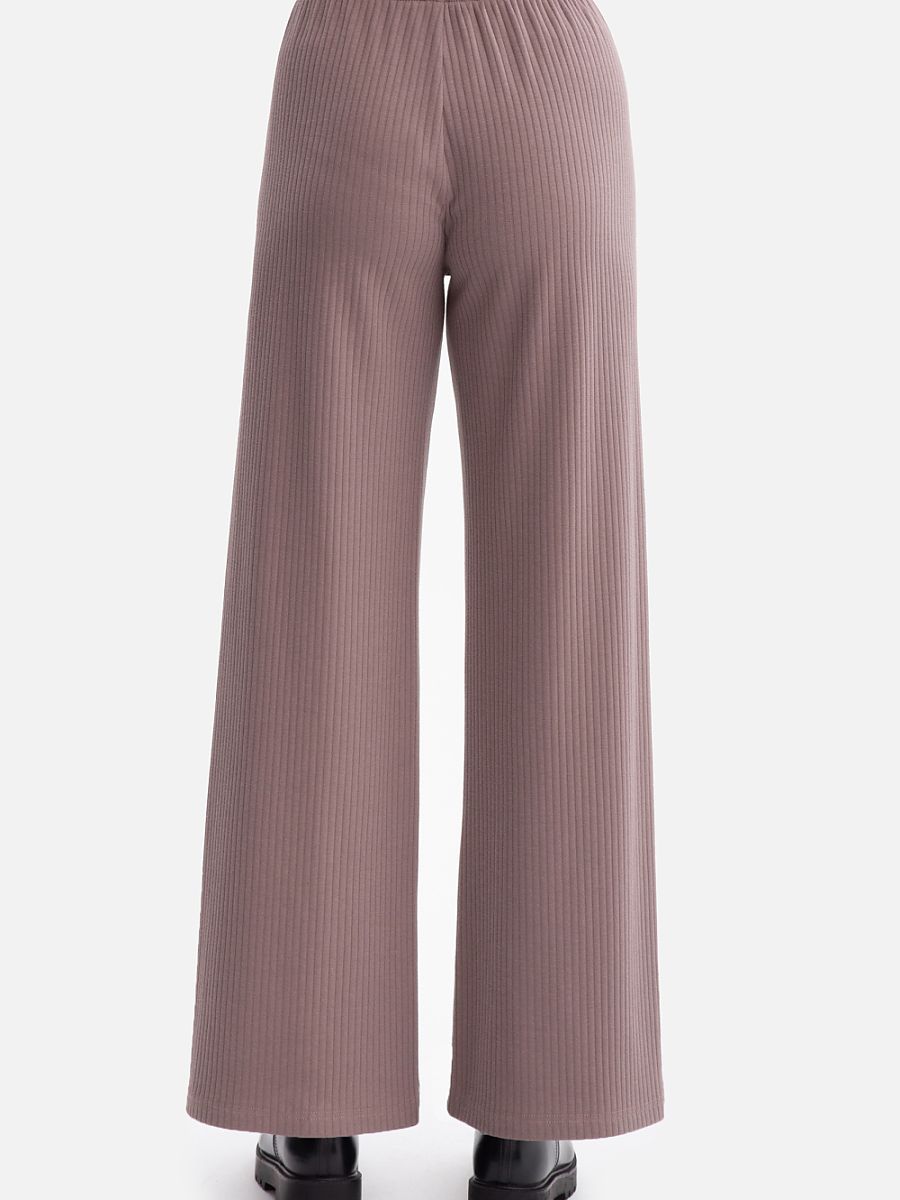 Women’s trousers made of ribbed fabric weighing 250 g, which is soft, elastic and pleasant to wear. The model has no pockets or lining, with a practical elastic waistband ensuring comfort and a perfect fit to the silhouette. The loose fit, knitted trousers are fitted at the waist and hips, and then fall loosely, guaranteeing comfort and lightness. Long, straight legs slightly flared at the bottom slim the silhouette and add elegance to the whole look. The mid-rise makes the trousers fit well and highlight the waist, while the full length to the ground gives them a modern, leg-lengthening effect. Designed and made in Poland from fabric produced in Łódź, it is a combination of comfort, quality, and timeless style.