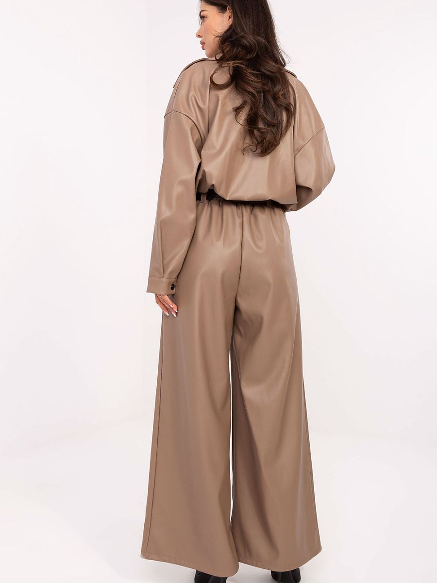 Stylish and comfortable palazzo pants made of high-quality eco-leather (a combination of polyester and polyurethane). The wide-legged model with a high waist beautifully emphasizes the waist, while providing freedom of movement. An elastic band is sewn into the waist, allowing the pants to perfectly fit the silhouette. Additionally, they have a fastened belt that allows you to accentuate the figure and add an elegant touch. The model has side slip pockets and a smooth material surface, giving it a modern, minimalist character. This is an ideal proposal in a casual style, suitable for both everyday wear and work, guaranteeing comfort and a fashionable look throughout the day.