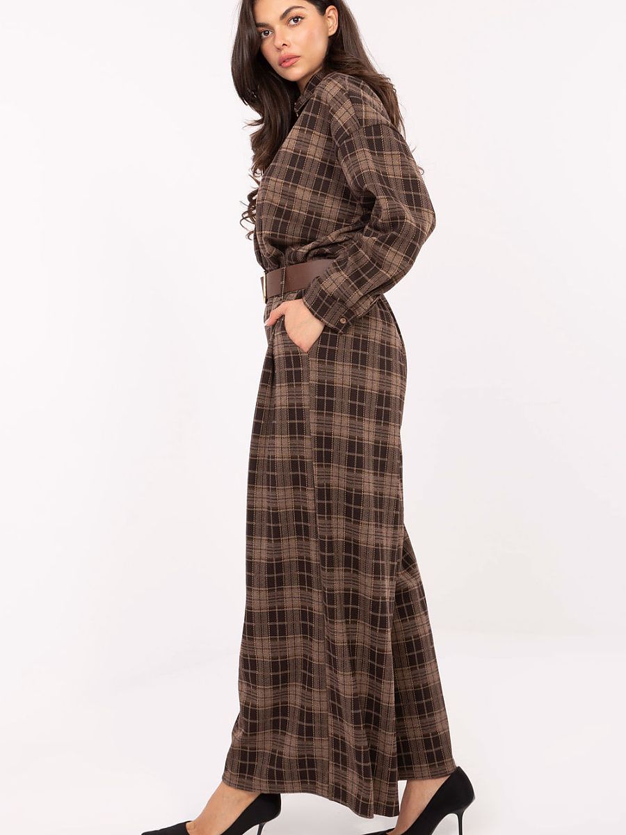 Modern and comfortable women’s flannel palazzo pants with a casual character, ideal for everyday styling. Made of high-quality polyester, viscose, and elastane blend, they provide comfort, lightness, and delicate elasticity, making them fit the silhouette perfectly. The model has a high waist and wide palazzo-style legs, which visually lengthen the legs and give the silhouette lightness. Side pockets and a fastened belt add practicality and allow you to emphasize the waist. The pants have a checkered pattern, which introduces a classic, timeless accent, and the lack of a fastening makes them extremely comfortable and easy to use. This is a versatile model that will work perfectly in both everyday, casual stylings and in more elegant work outfits.