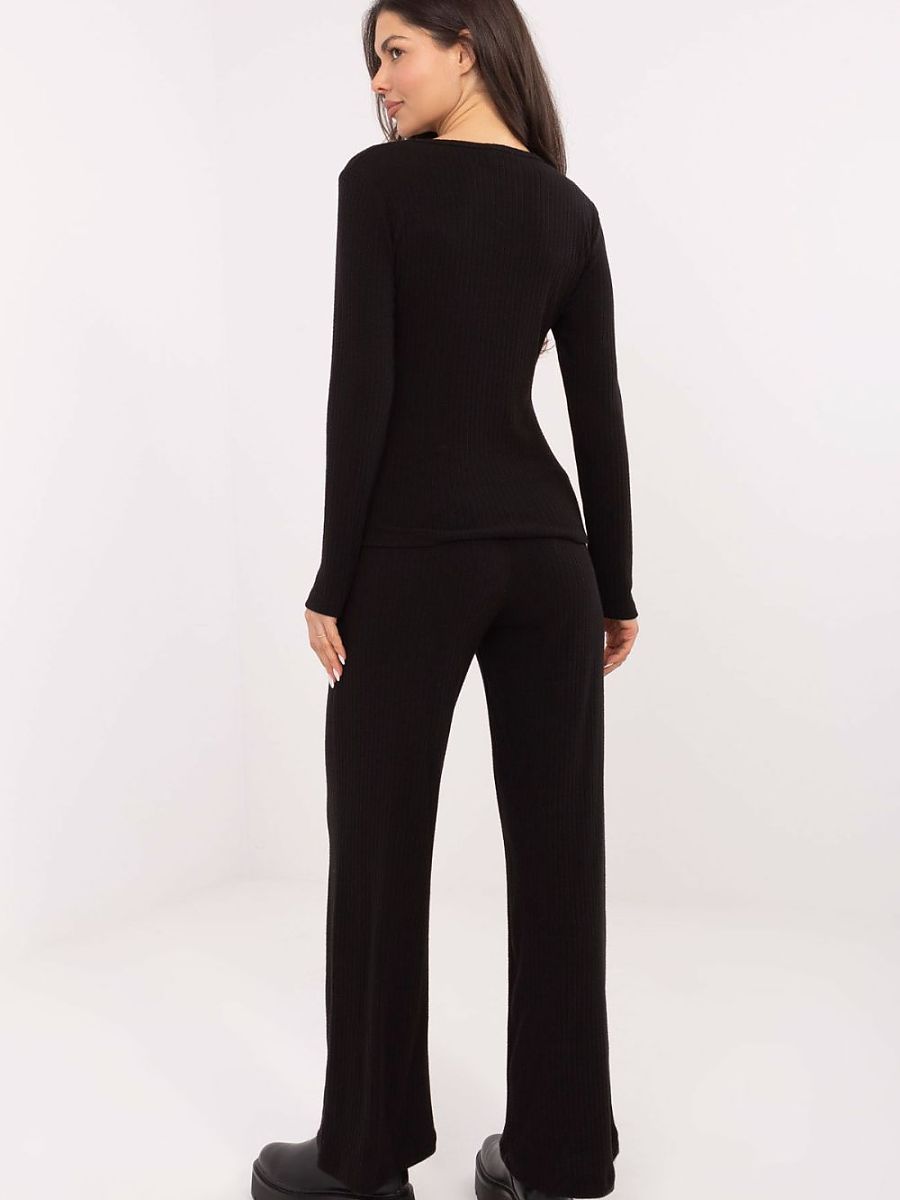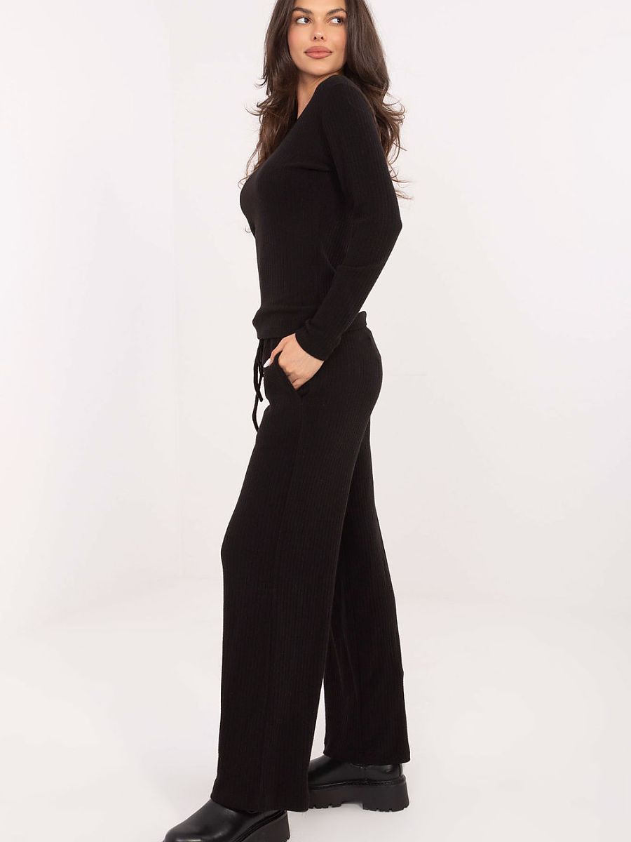 Comfortable women’s knitted trousers in a casual style are the perfect choice for everyday occasions, when comfort combined with a modern look is important. Their smooth, minimalist pattern makes them perfectly suited to many stylizations, from sporty to more elegant ones. The model is made of a pleasant to the touch blend: viscose, nylon and polyester, which ensures flexibility, durability and high wearing comfort. The high waist emphasizes the waist and visually elongates the silhouette, while the wide legs give the trousers a fashionable, slightly loose character. The waist features a tie, allowing for a perfect fit, and side slip pockets add practicality. The ribbed structure of the material complements the modern, stylish look. These are trousers that will work great both at home and outside – soft, comfortable and always fashionable.