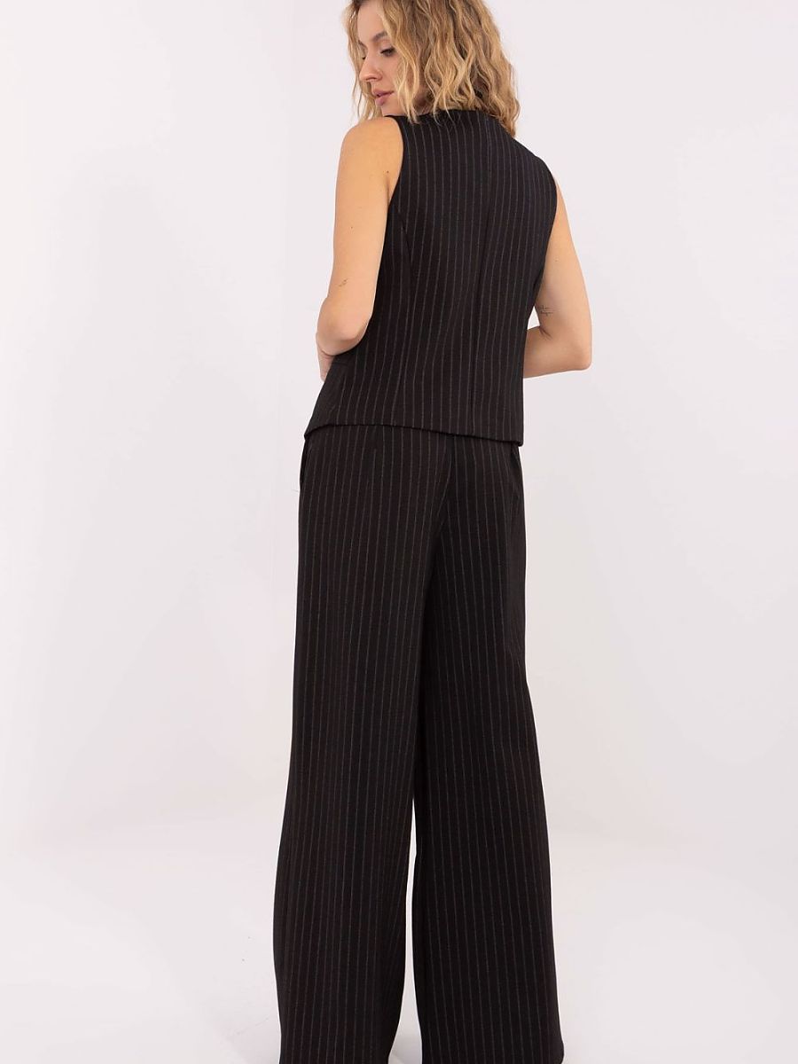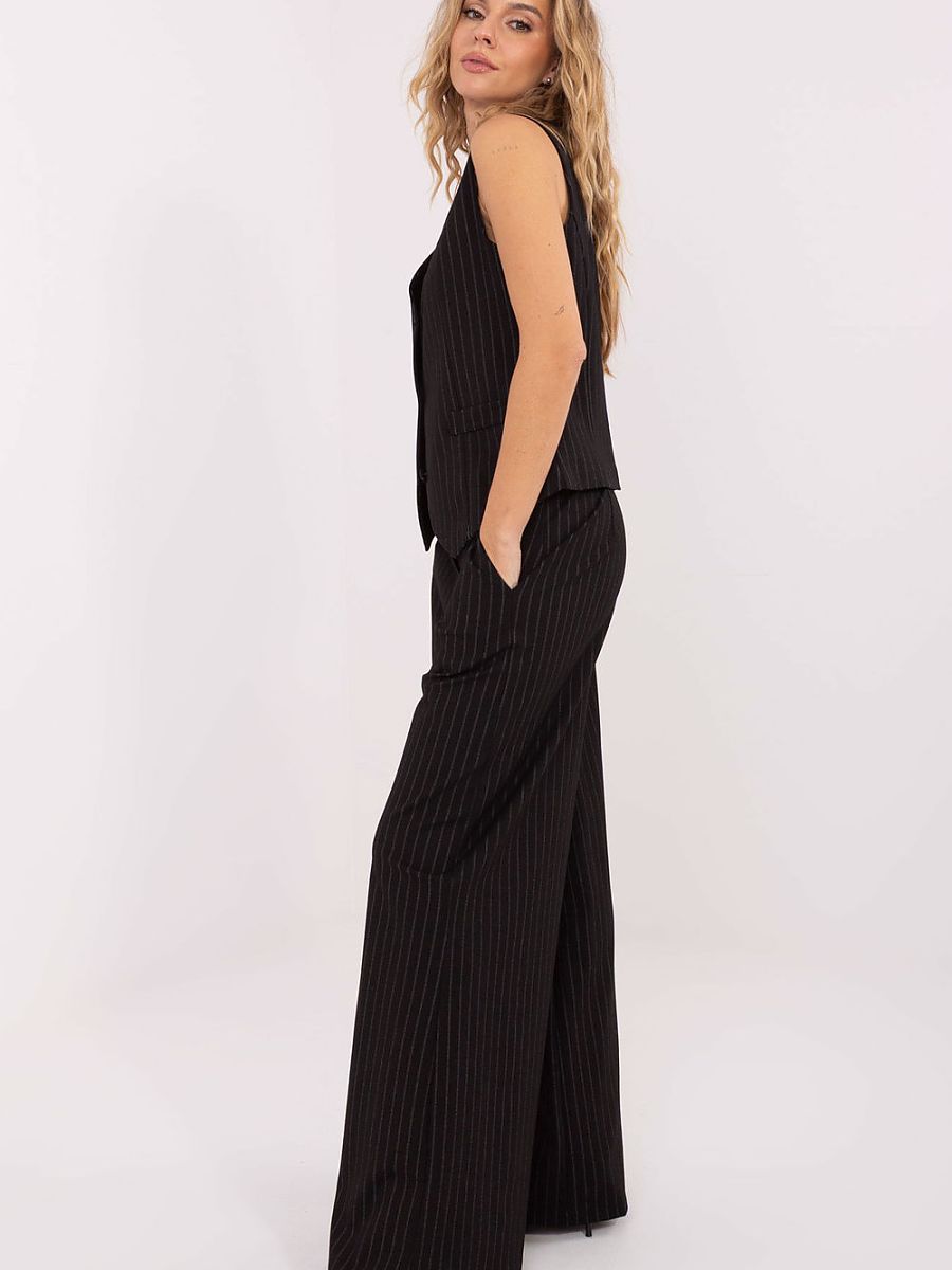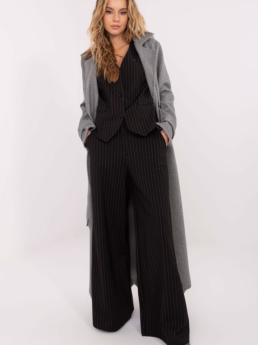 Stylish women’s wide leg palazzo trousers are a proposal created for women who appreciate elegant style combined with comfort. They are perfect for everyday wear, for work, as well as for special occasions, adding lightness and class to outfits. The striped pattern subtly slims the silhouette and emphasizes the modern character of the model. Made of high-quality blend of nylon, viscose, polyester, and elastane, the trousers are light, flexible, and comfortable to wear. The high waist beautifully accentuates the waist, while the wide palazzo legs give the whole outfit an elegant, casual character. The model is equipped with a zipper and buttons that ensure a stable and comfortable fit. Side pockets add functionality while maintaining an elegant appearance. These trousers combine chic, comfort, and timeless style, perfect for creating stylish, feminine outfits for various occasions.