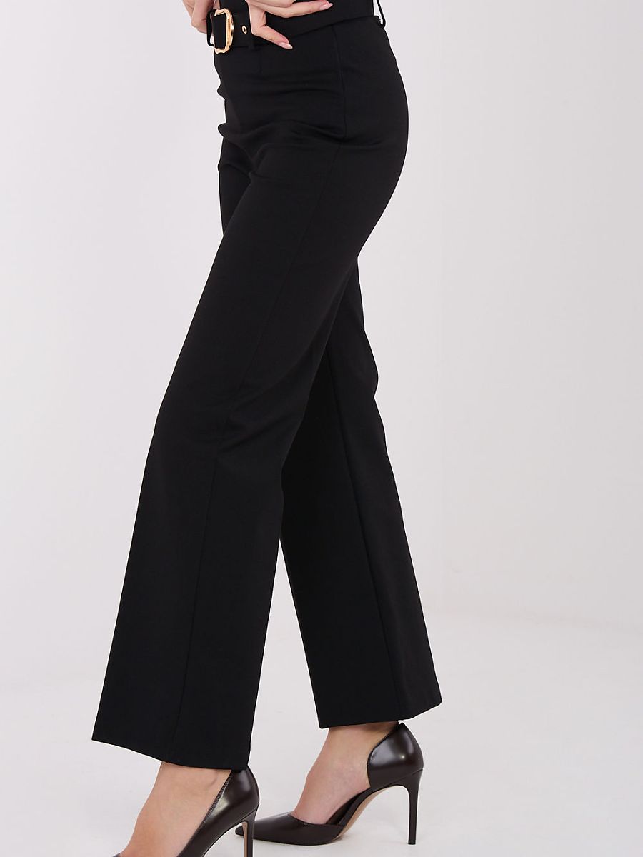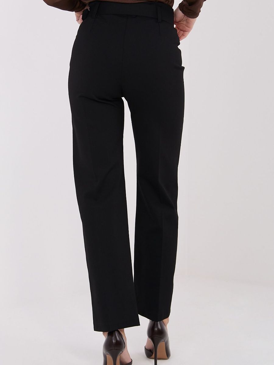 These stylish trousers were created with women in mind who value elegance combined with comfort. Made from a high-quality blend of viscose, nylon, and elastane, they provide a perfect fit and comfort all day long, regardless of the occasion. The smooth, classic material gives them a timeless look, and the high waist beautifully accentuates the waist and elongates the silhouette. The straight leg design makes the trousers look elegant and stylish, perfect for work, everyday outfits, and formal styling. The model is fastened with a concealed zipper, emphasizing the neat finish. An additional advantage is the belt fastened at the waist, allowing for a perfect fit and serving as a subtle decorative accent. The characteristic cuff at the back of the leg adds sophistication to the trousers and emphasizes their elegant character. Universal, comfortable, and timeless, perfect for any outfit where style and comfort matter.
