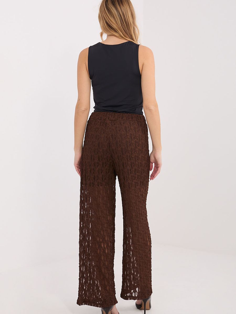 Elegant lace wide-leg trousers for women are a stylish proposal that will work perfectly for both everyday wear and special occasions or parties. The model combines comfort with exceptional, feminine design. The trousers are made of a combination of viscose and elastane, which ensures softness, elasticity, and a comfortable fit to the silhouette. The varied texture of the material gives the whole an elegant character and emphasizes the decorative style of the lace. The high waist and elastic waistband beautifully accentuate the waist and guarantee comfort throughout the day. Wide leg style visually elongates the legs and gives the silhouette lightness. The model without fastening, worn at the hips, is practical and comfortable to use. The lining in the upper part provides appropriate coverage and comfort, without disturbing the delicate appearance of the material. It is an excellent choice for women who want to combine elegance with modern cut and comfort.
